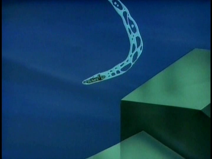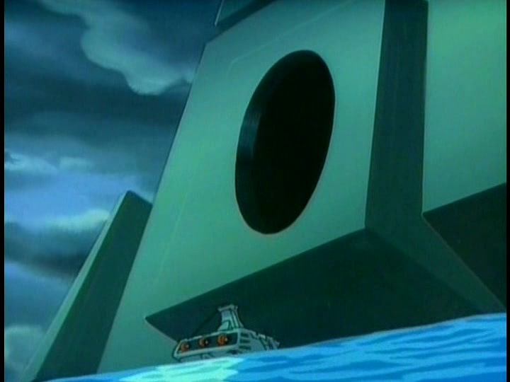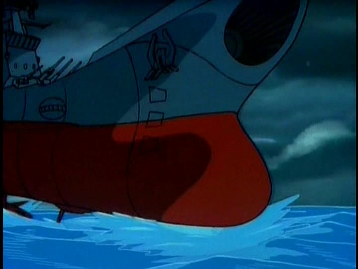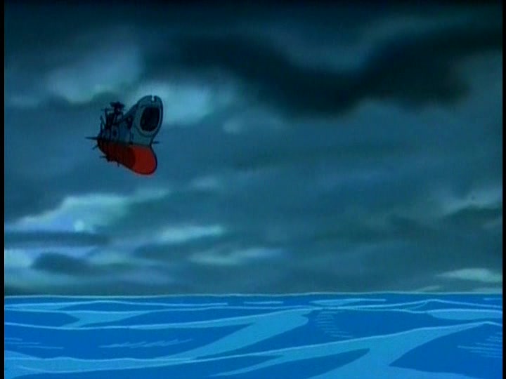 In a lovely bit of smooth animation, the Argo descends from the sky and arcs into the sea, bouncing once and then submerging. In the skies, Conroy and the Black Tigers begin their power dive towards the comet Empire–while near the great city, the Earth envoy ship turns around. The waiting General Dire is puzzled by what they’re doing until he is given word that enemy planes have been detected above.