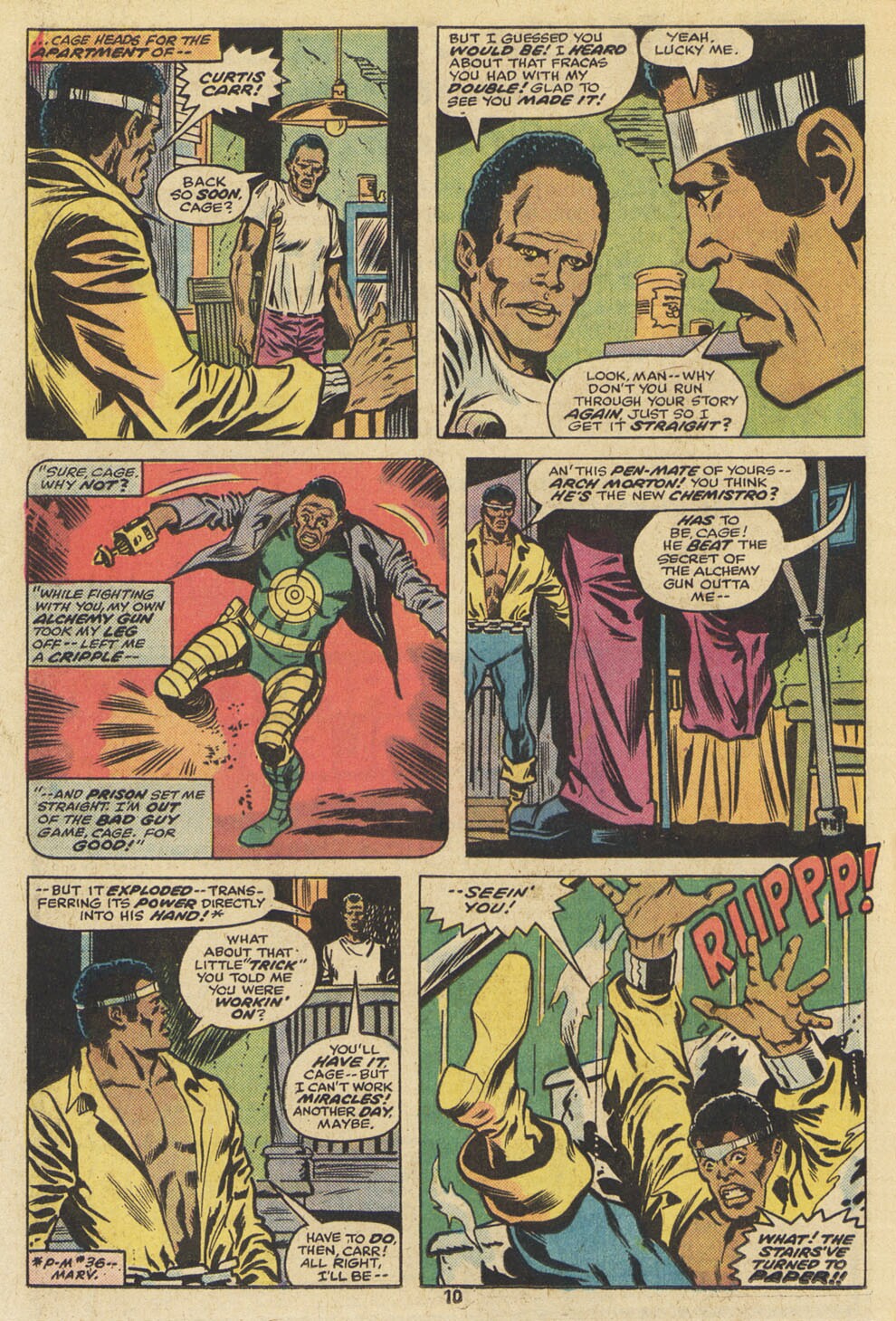 So what was Luke up to? As the issue starts, he’s in combat with his old foe Chemistro, who has him sinking into quicksand. Luke’s able to get out of this by diving to the bottom and smashing his way into the subways that run throughout Manhattan, but he’s no closer to finding out who this new Chemistro is. After a quick stop back at his office to pick up a change of clothes, Cage heads over to Curtis Carr’s place. Curtis was the original Chemistro, until he wound up blowing his own foot of with his alchemy gun. Now, somebody else has taken up the mantle, and Carr says he thinks it’s his old cellmate Arch Morton, and promises to hook Cage up with a gizmo that will turn the tide of battle.