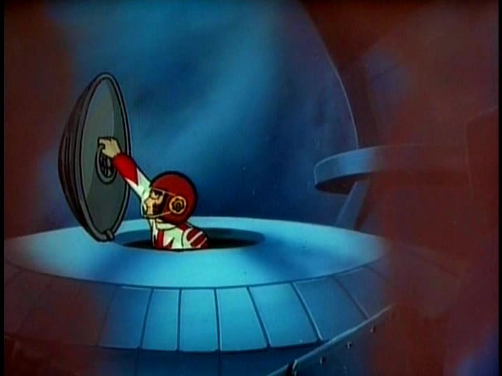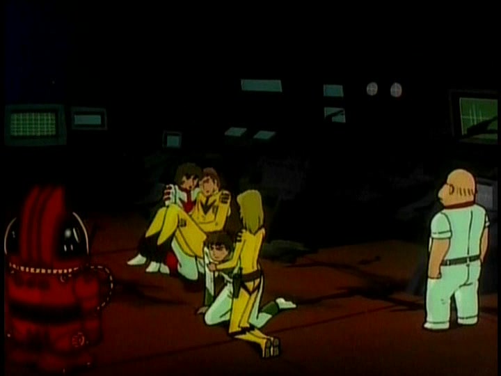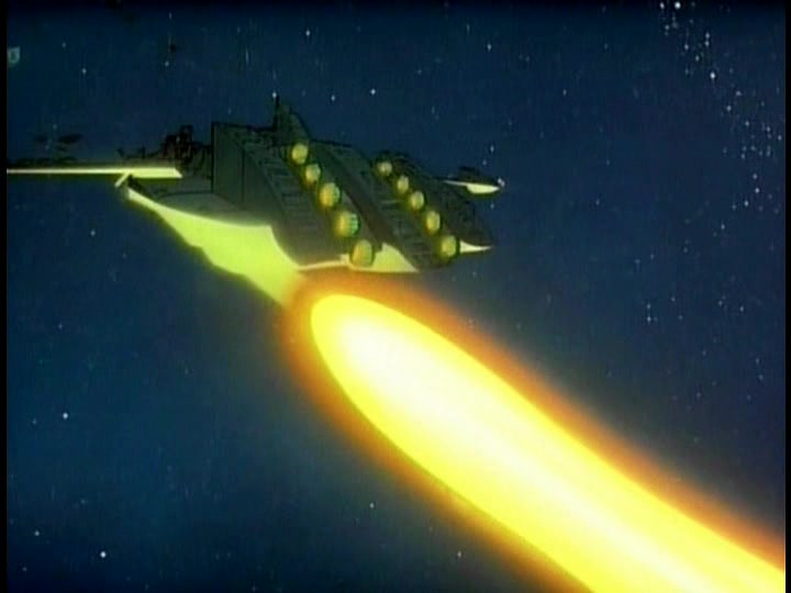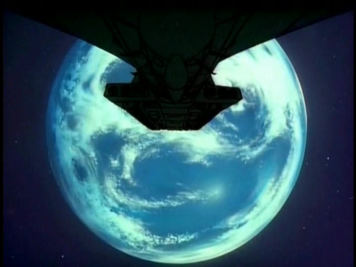 Zordar turns his warship towards the Earth, intending to force the defeated Star Force watch as he lays waste to the planet. His ship deploys an enormous bazooka-like weapon, and he starts firing potshots at the surface far below. These images are harrowing, probably even more so for Japanese audiences who could still remember the ravages of the Atomic Bomb. Some minor casualties are edited out here, in particular in the Defense Command chamber, where the Earth Commander watches impotently and waits for the end. On board the Argo, Wildstar thinks to himself, “Zordar must be stopped! But how?“