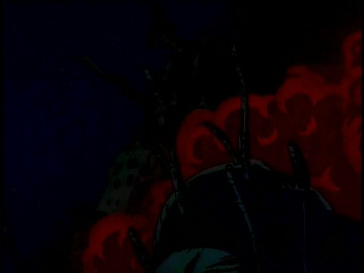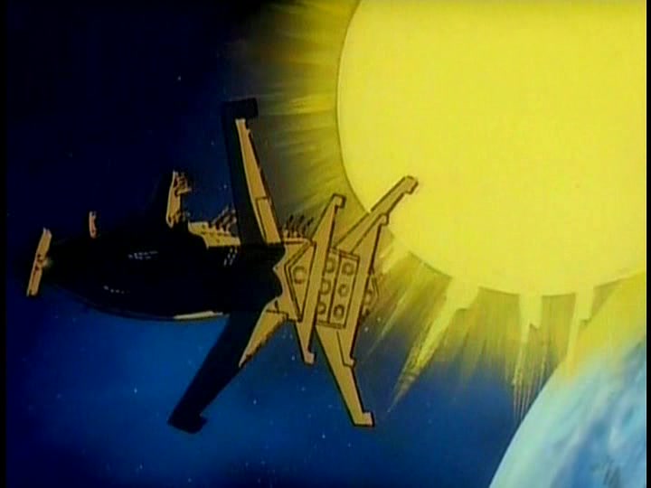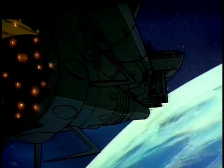 Venture is still non-responsive, so Trelaina is giving him a transfusion of her Life Force to revive him. In YAMATO 2, this is more directly a blood transfusion–Trelaina even talks about how she’s beginning to grow cold, but that she’ll still give Venture every drop of blood she has left in her if it will bring him back to life. And he does begin to stir, giving her hope. As her craft rounds the moon, she’s able to see the flaming wreck of the Argo in the distance, as well as Zordar’s dreadnought attacking the Earth, and she is alarmed by these developments.