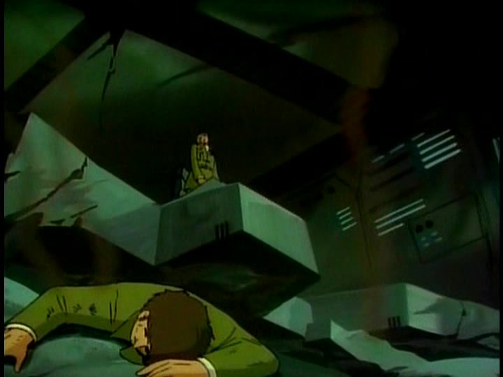 In a somber scene, the crew is evacuated. Wildstar carries the legless Sandor on his shoulder, and the older Engineer gives him some advice: “Don’t give up! You know, we should remember what Desslok said. He said as long as he lived, Gamilon lived. Well, as long as we live, Earth lives. If we have to, we’ll find another planet to live on. That’s what we live for, Wildstar!” Wildstar can only nod mutely.