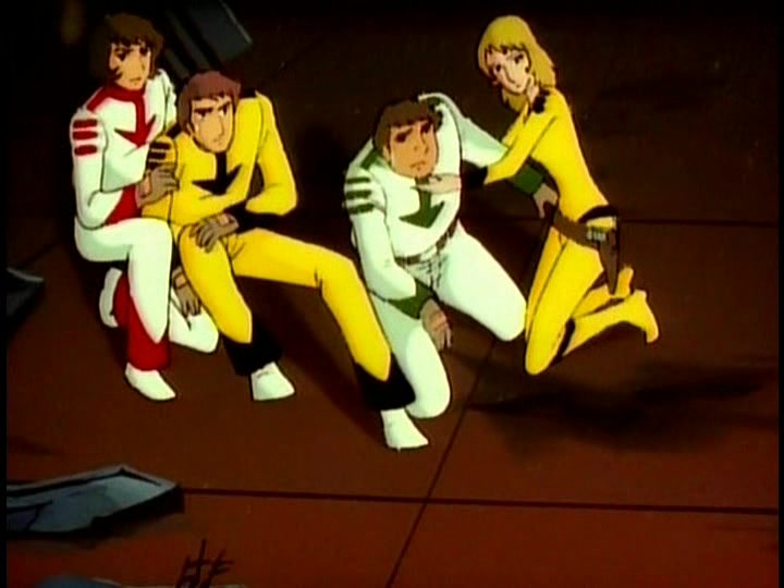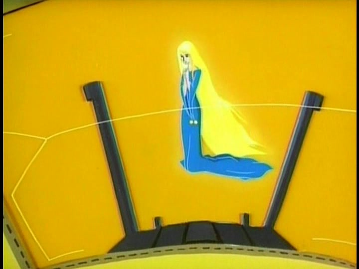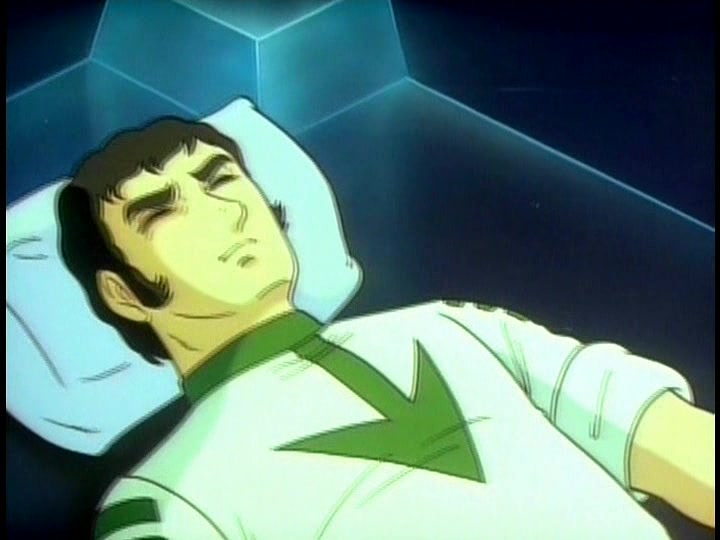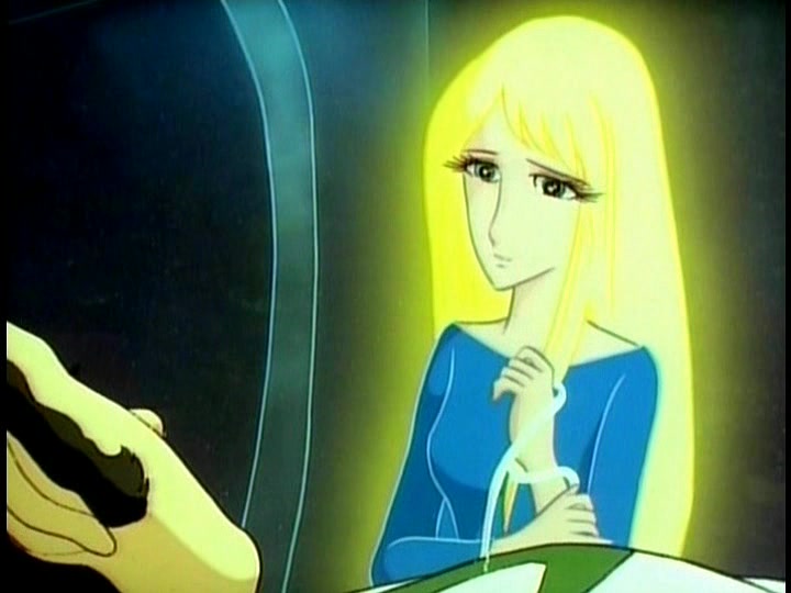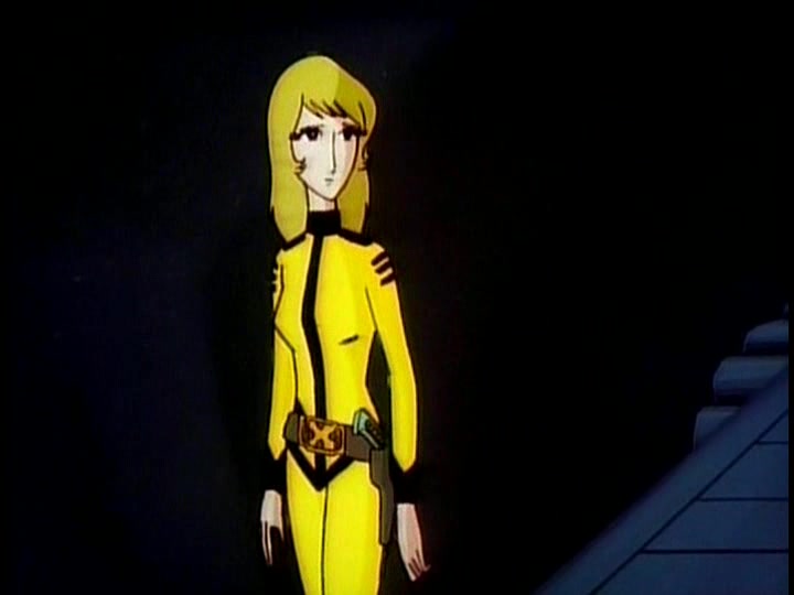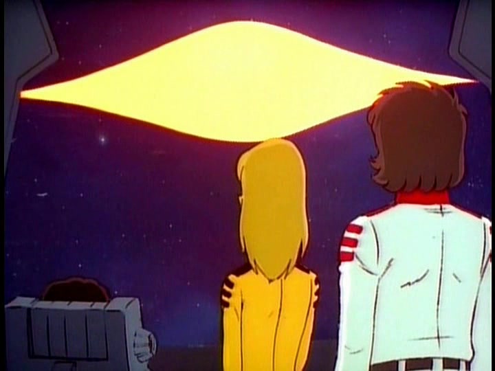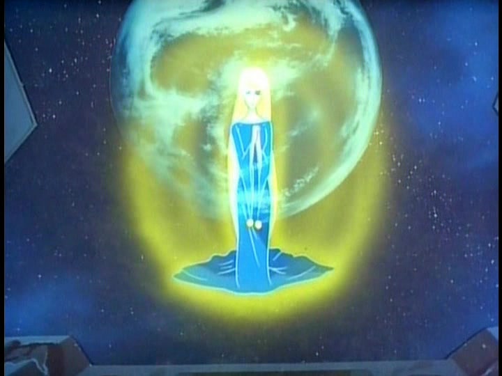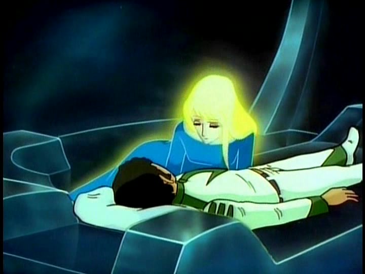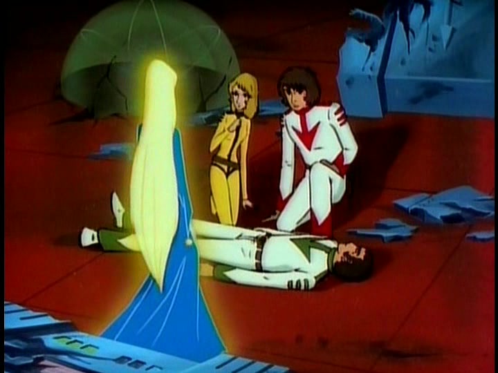 “Target: Zordar’s space ship! Argo, make us proud!” And the battleship begins to move towards the enemy. In YAMATO 2, this moment is accompanied by the haunting dirgelike refrain from the theme song. But ten, there’s a bright light ahead of them, and Trelaina is there, carrying Mark Venture’s unconscious but still living body. She teleports herself and her charge on board the Argo’s bridge, telling Wildstar and Nova that she’s come to return Venture to them, for she cannot take him back to Earth. This is phrased like a limitation, as though her power would destroy the Earth were she to set foot on it, but this isn’t further elaborated on.