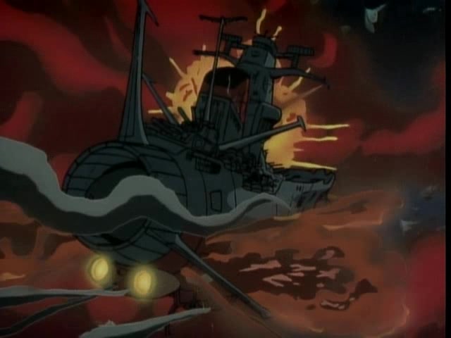 This scene plays out differently in YAMATO 2. There, Wildstar has remained behind because of the guilt he feels about causing Earth’s destruction, but he has no plan for fighting back. It’s only as he collapses to his knees and begins sobbing that he decides to turn the ship itself into a weapon by kamikazeing it into Zordar’s dreadnought and detonating the Wave-Motion Engine–and he asks Captain Avatar’s spirit for forgiveness for going against his teachings that they must live on no matter the hardship. This itself is a major reversal from SARABA, in which it is Avatar’s own spirit that advises Wildstar not to give up, and to make his life a weapon. It was the desire to refute these sentiments that motivated much of the production of YAMATO 2 (as well, of course, as the desire to produce further installments of the series.)