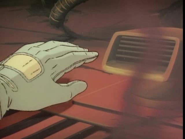 Meanwhile, down in the engine room, Orin is hit–and his death is a certainty, since he also perished in SARABA, the film that YAMATO 2 was amending in order to keep the property alive. With his last breath, he radios the bridge, telling Wildstar that the engine output is falling, but that the ship can still move–before his lifeless hand falls onto the console and out of frame.