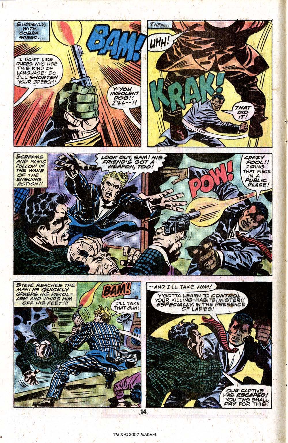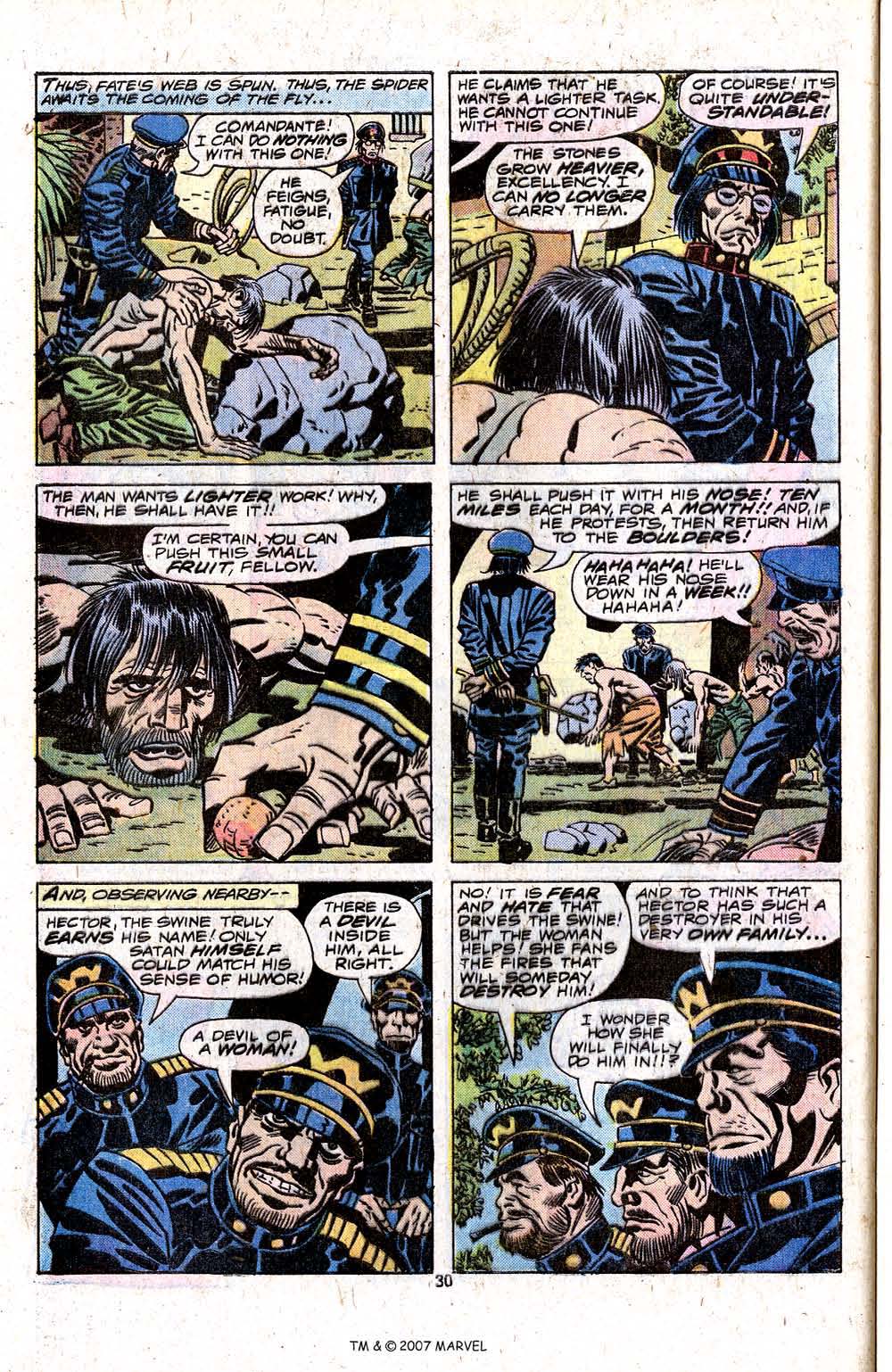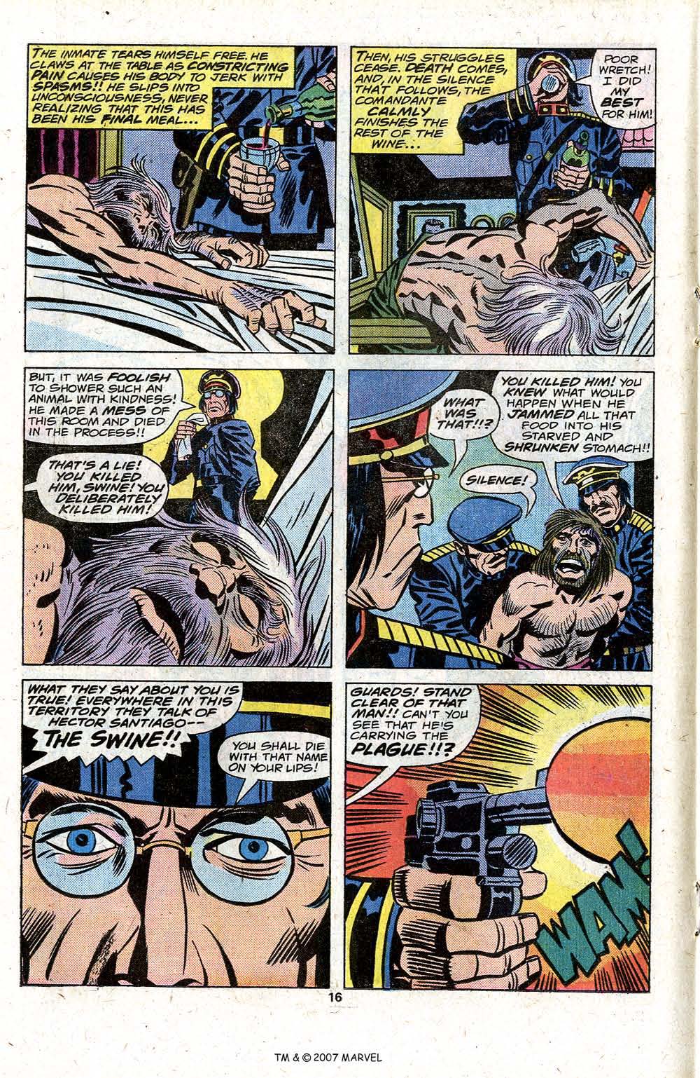 The scene above is one. But before we get to that, let’s backtrack. The issue opens with Cap reunited with the Falcon and his girlfriend Leila, whose memories have returned after last month’s adventure in which they were stricken with amnesia. The trio sets out for home, but Cap is worried about is relationship with Sharon Carter, as Sharon would prefer that he put all of this super hero stuff behind him. From there, we cut to a prison in Central America where the Commandant, known as the Swine, is brought two prisoners who have been causing trouble. When the men claim that they’re simply starved, the Swine offers one all he can eat from his own table–and forces the man to eat himself to death. It’s a horrifying sequence, and Kirby was talking about something he knew very well, Nazis, through the lens of what was going on in the world in the 1970s. It’s a moment of cruelty I’ve never forgotten.