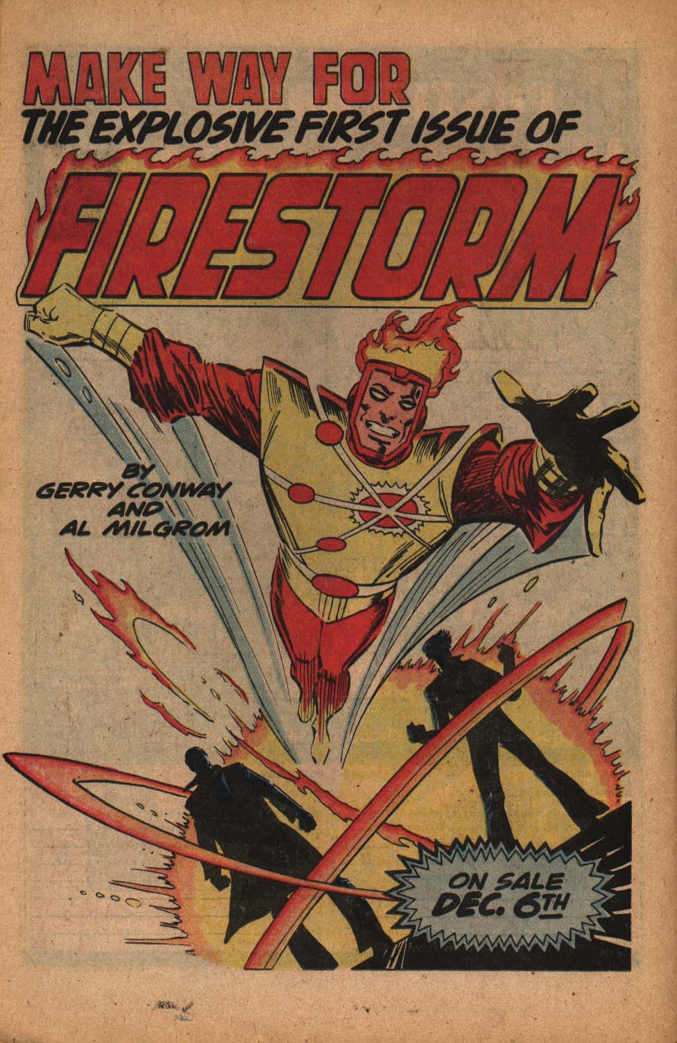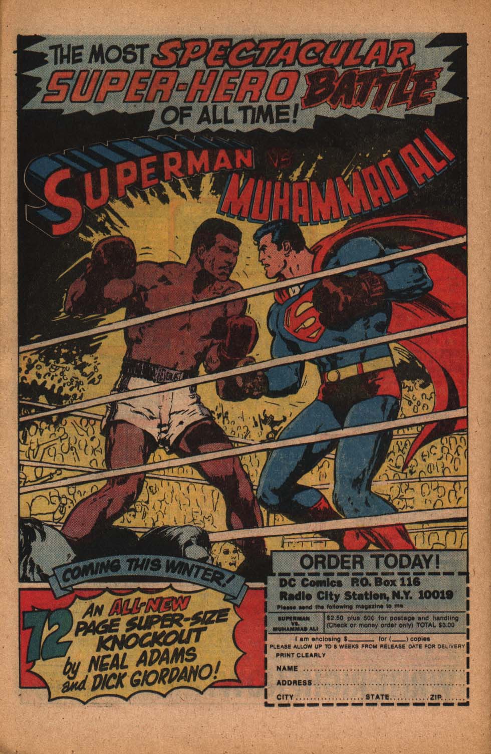 It’s worth pausing at this point to note that this issue carried house ads for three books that I never saw as a young reader, for they didn’t turn up at my regular 7-11: Power Girl’s origin in SHOWCASE, the debut of FIRESTORM in his own series, and the oversized SUPERMAN VS MUHAMMAD ALI. In this era, with circulations falling, outlets in my area weren’t bothering to stock any new DC titles, which was becoming a problem for me.