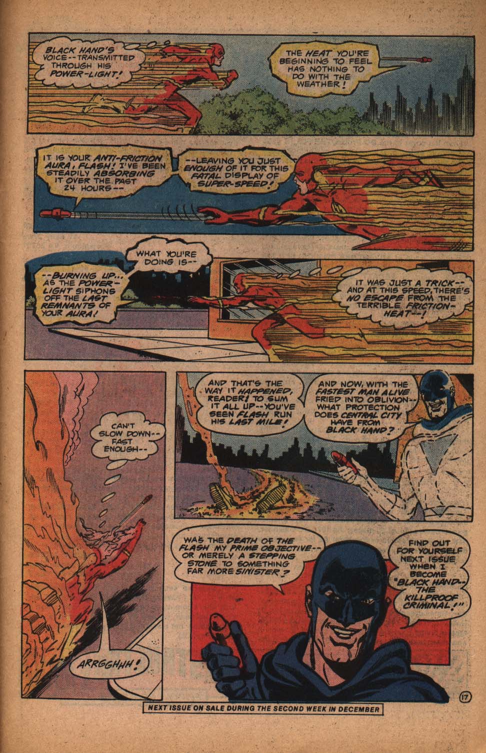 Black Hand escapes–and while Barry can’t seem to figure out just why the villain showed up and attacked him out of the blue, Black Hand once again directly addresses the readers, and lays out his master plan. He reveals that, when he first shook hands with the Flash, his power-light set up a siphon through which it has been gradually stealing away the Flash’s protective super-speed aura. Once this process is completed, Flash will have no protection from the effects of his own speed–and the next time he takes off running, he’ll be burned to a crisp by the friction.