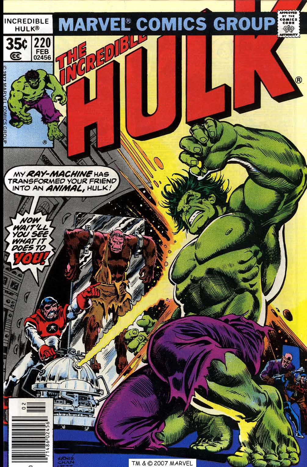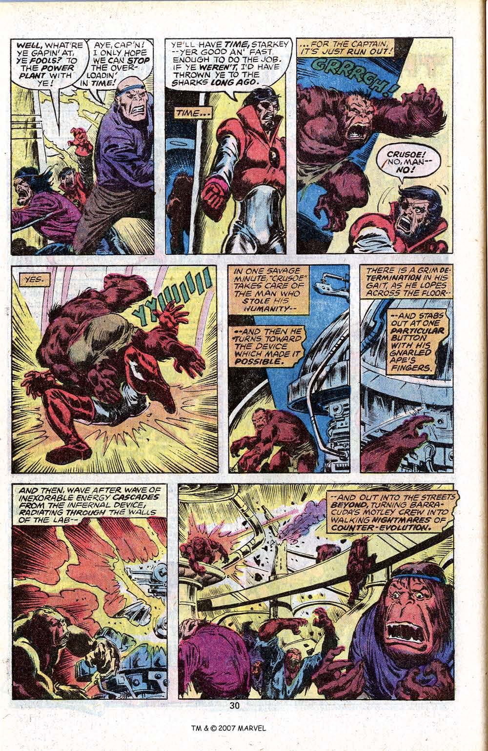 But Barracuda still has the gamma device, which he uses to zap the Hulk, turning him back into an unconscious Bruce Banner. But he’s failed to reckon with Crusoe, who jumps him and pummels him mercilessly. Guided by some primitive instinct, Crusoe activates his devolver machine, which turns the whole of Barracuda’s crew into raging beasts. As chaos erupts all around them, Crusoe gently carries Banner and his dog to an escape craft, and sends them on their way before the base explodes around him, its power plant having been critically damaged by the Hulk earlier. The issue ends with the capsule containing Banner and the dog bobbing gently on the waves, headed for who knows what new adventure.