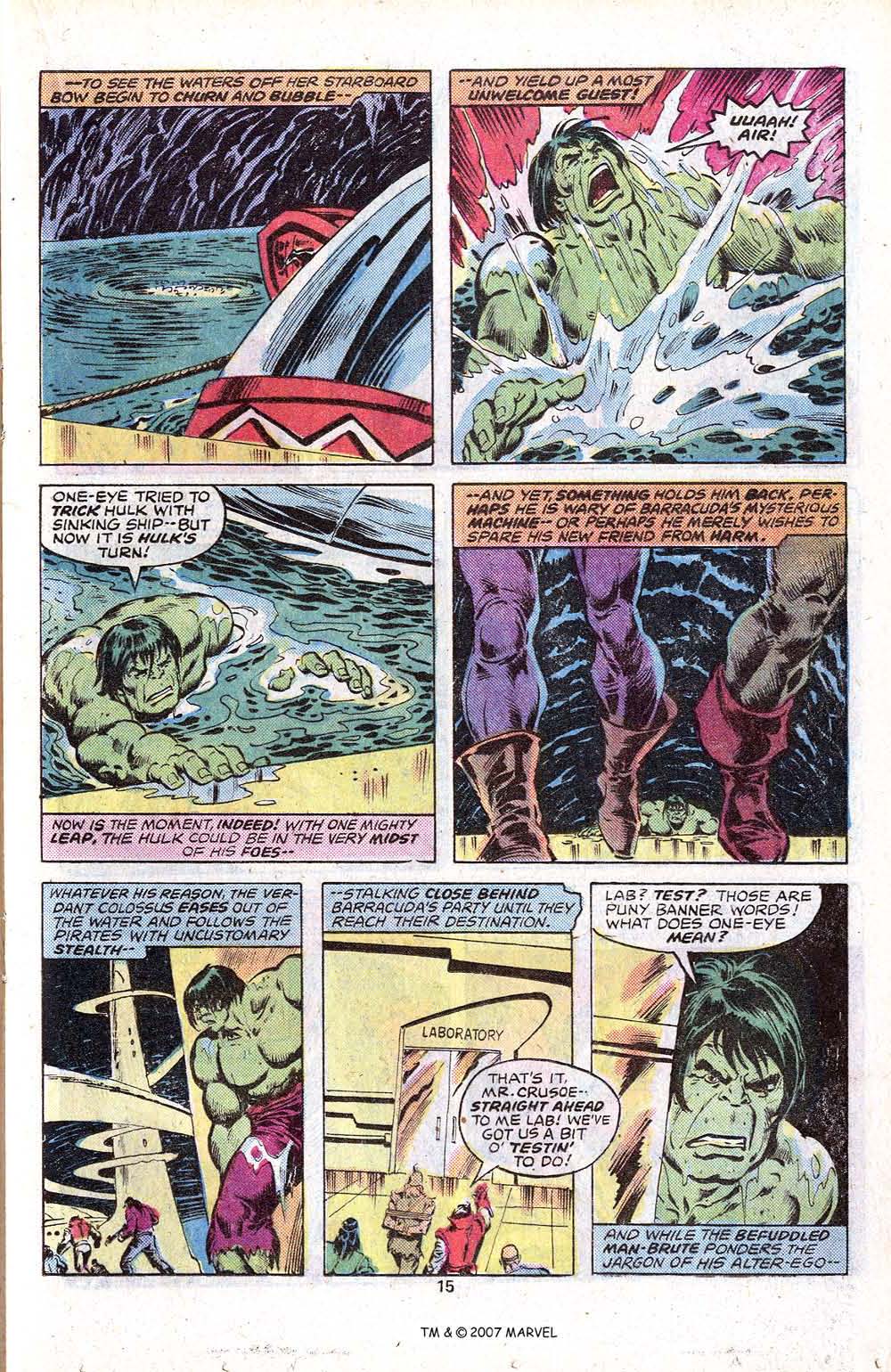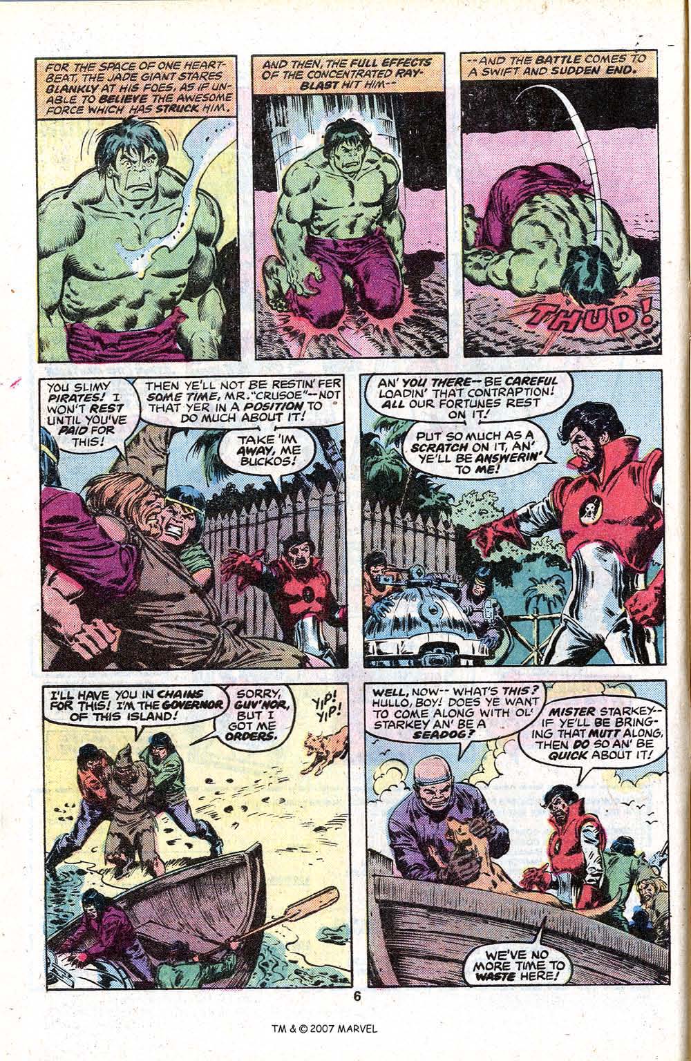 Writer/Editor Len Wein felt differently about the Hulk than I did. The Hulk was his favorite Marvel character, and he wrote the series with depth and emotional sophistication, while at the same time steering into the absurdity of the concept. Case in point, the story picks up here from the previous issue, where the Hulk has befriended an amnesiac scientist who has adopted the identity of the fictitious Robinson Crusoe. All you could do was roll with it. But Cap’n Barracuda and his band of cutthroats want the gizmo teh scientist had been working on, and so they invade the otherwise-quiet island, putting them into conflict with the Hulk. Bad move for them, right?