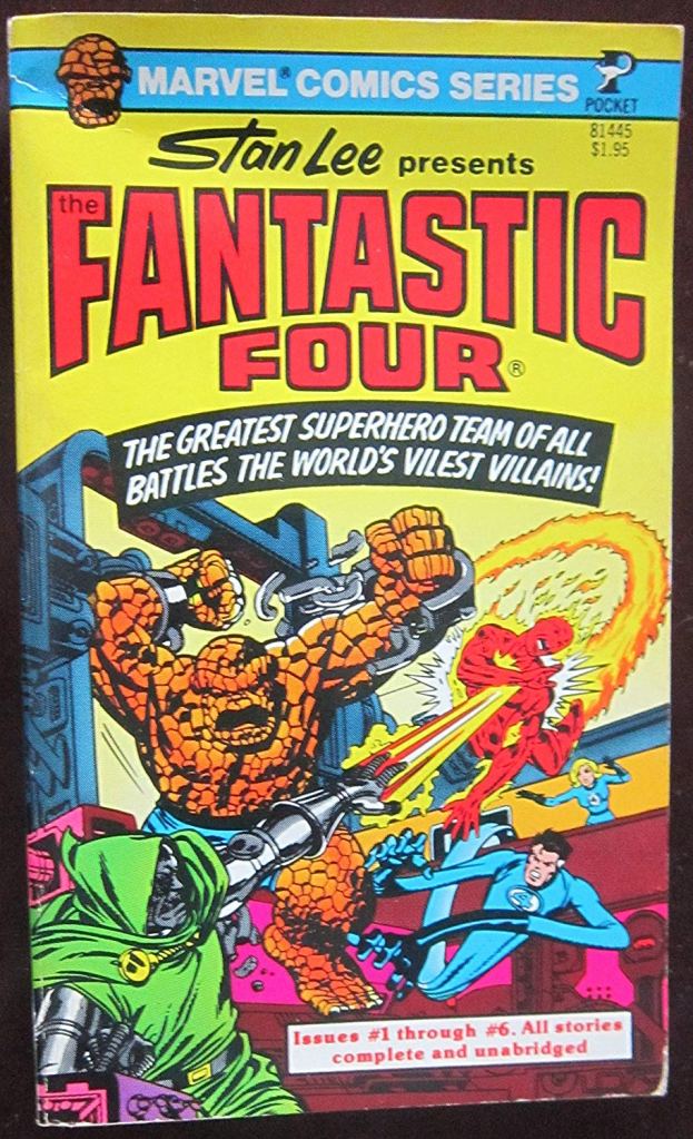 This FANTASTIC FOUR Pocket Books paperback reprinted the first six issues of FANTASTIC FOUR in their almost-entirety–almost, because they dispensed with some of the pin-up pages and all of the letters pages. But the stories and the covers were there, and that’s what I cared about the most. I read the hell out of this little book, and my copy today shows a greater amount of wear and tear than the other volumes in the series, which I would get later. You have to understand, this was in a time before Marvel Masterworks and Essentials volumes and Epic Collections–this was literally the first time that FANTASTIC FOUR #1-6 had been collected together under one cover.