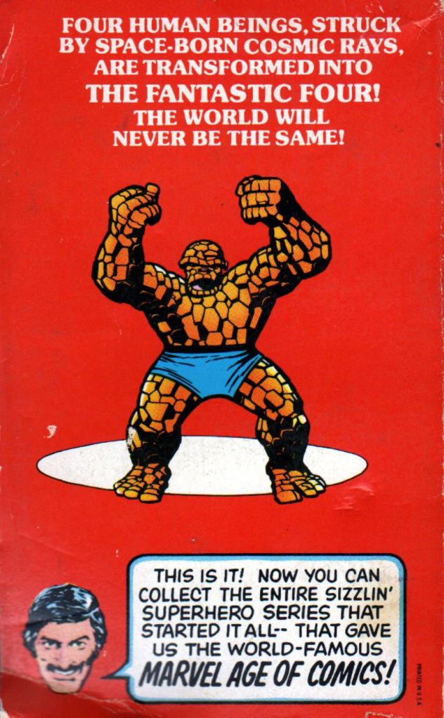 It was one of the most exciting days of my young comic book collecting career. I found it in the bookstore in the Smithhaven Mall, a regular stop whenever my family went out shopping there, which was often. I had no idea that it was coming out–which is strange, because ads for it appeared in FANTASTIC FOUR #191, which we looked at yesterday, so possibly I wound up picking up this book first. Either way, I found a copy of this Pocket Books FANTASTIC FOUR volume on the shelves in the humor section (which is where all of the books even vaguely related to comics ended up) and felt like I had hit the jackpot.