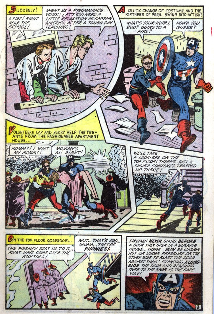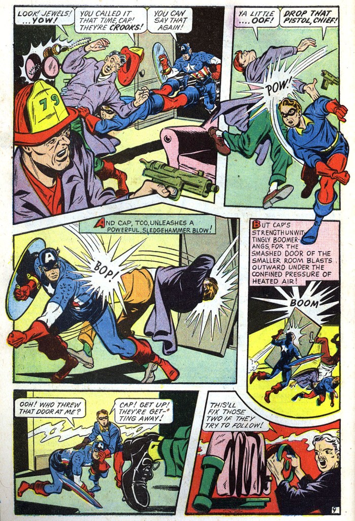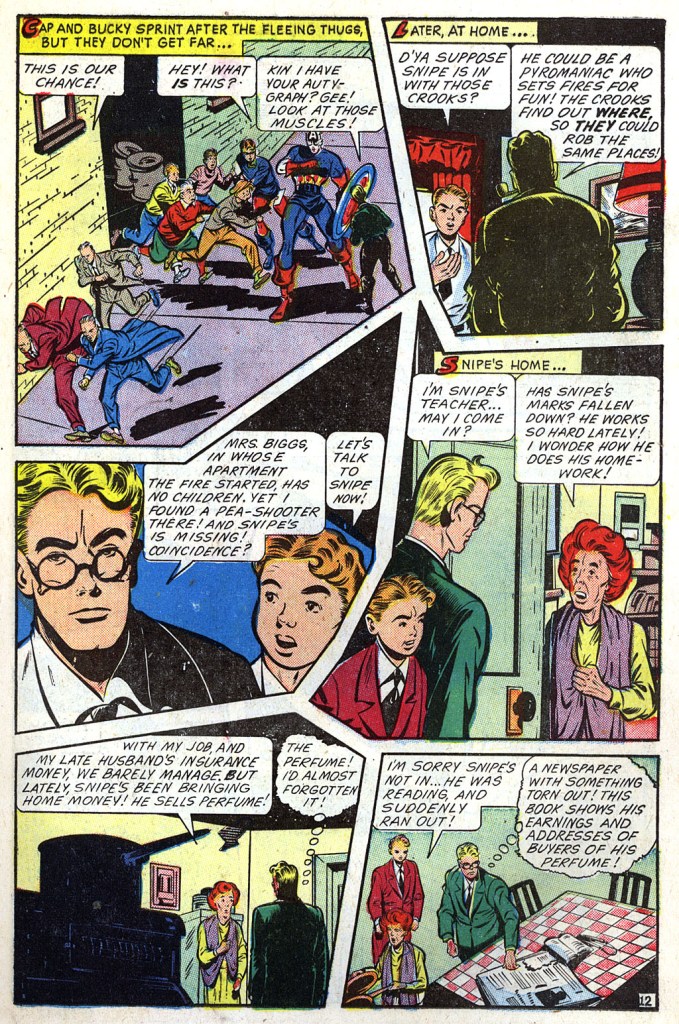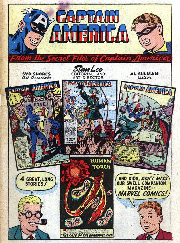 And so, in CAPTAIN AMERICA COMICS #59, Cap was given a new backstory and a new status quo. This is one of the first times that such a change in direction was made to a major character, but it was an absolute necessity in this case. The GCD credits BATMAN co-creator Bill Finger with writing this story, and they suspect that the artwork is by Jack Binder and George Klein. This story set up Cap and Bucky’s status quo for the remainder of the Golden Age.