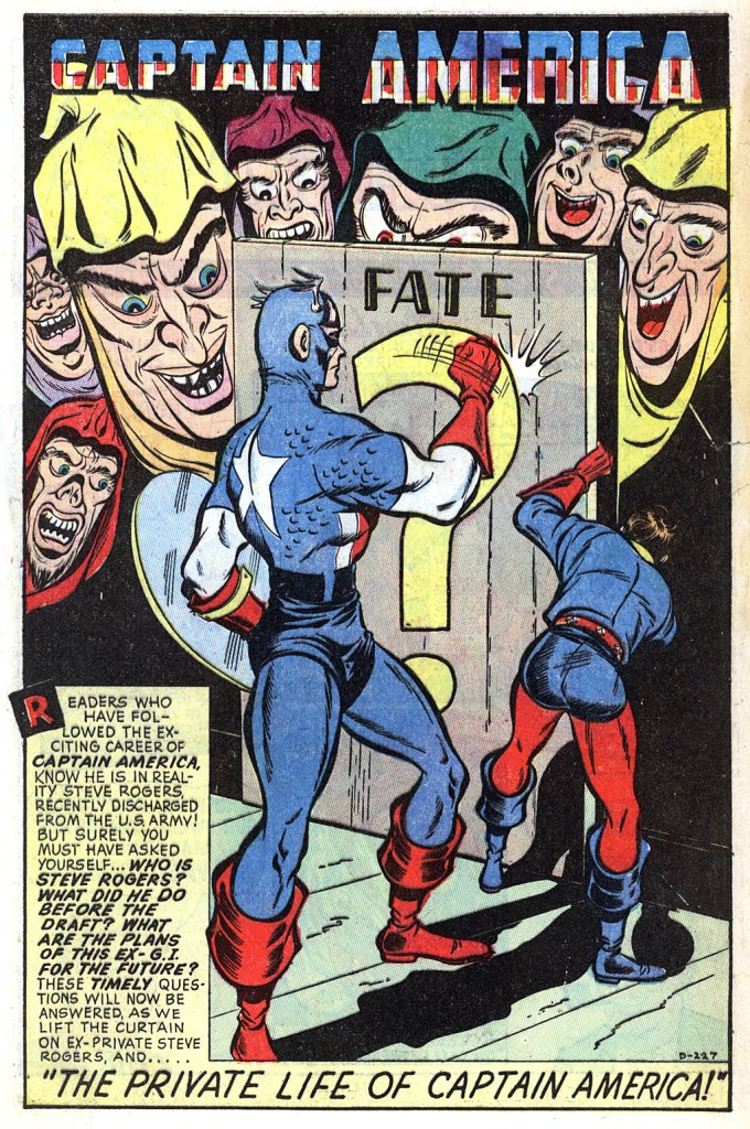 For a while–a good, long while–the end of the war was pretty much ignored in the series, and Cap and Bucky continued to face the same sorts of menaces (often with a Now-It-Can-Be-Told disclaimer.) But eventually, that became too difficult an illusion to maintain, so the Captain began battling domestic criminals, his background and life situation entirely ignored. Cap and Bucky were Cap and Bucky all the time, but their battles against colorless mob goons weren’t especially memorable, and sales were drooping. Something had to be done.