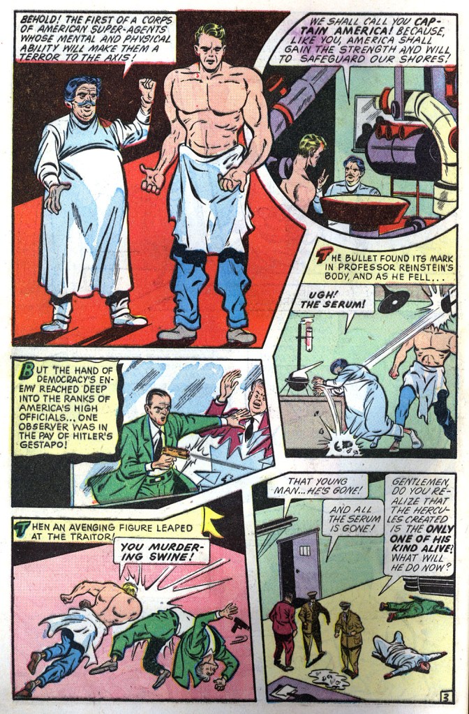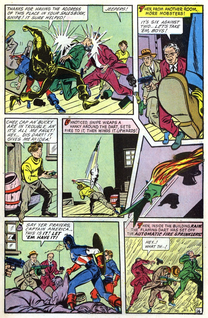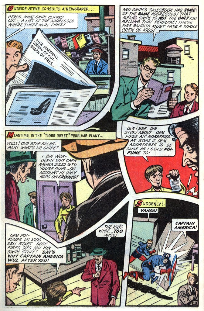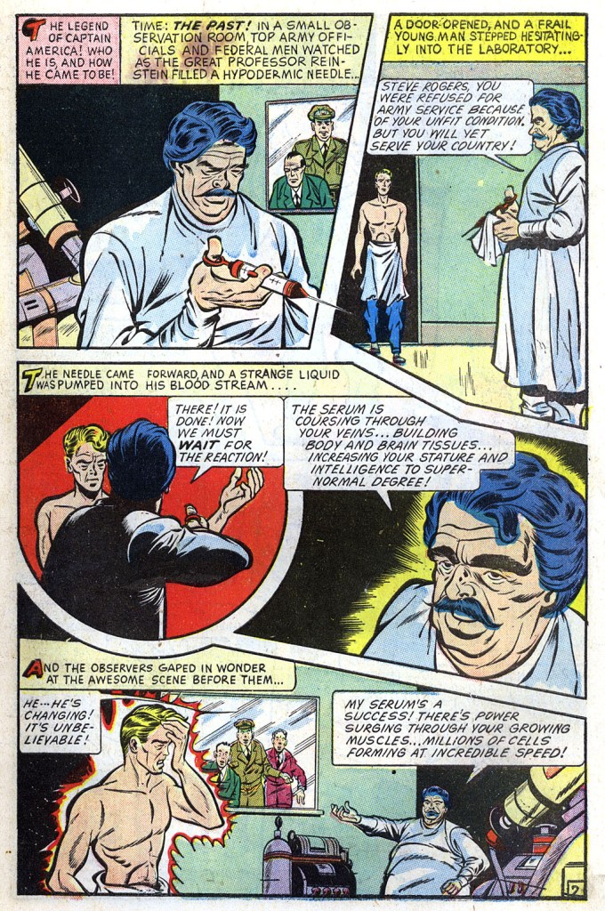 I’m reasonably certain that this is the first time that Cap’s origin was retold since the first issue. And the sequence of events and even images draws directly from Joe Simon and Jack Kirby’s original. Though it does look like some lettering changes were made on this page.