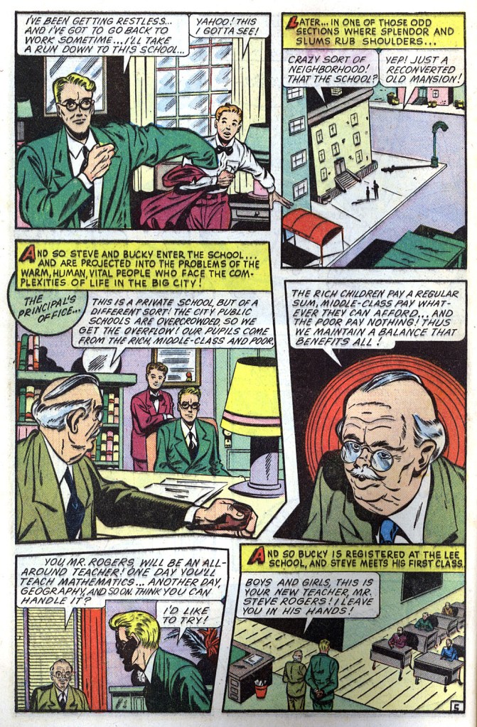 All of this matches the Simon & Kirby version almost precisely. But in the present, no account has been taken of the passing of time–Bucky is still exactly as old as he had been in 1941. And now, Cap was retroactively a schoolteacher before the war, which seems like a bit of a stretch, but go with it. He also wears glasses for some reason and smokes a pipe. It’s also worth noting that the school Steve Rogers is offered employment at is the Lee School, named after editor Stan Lee.