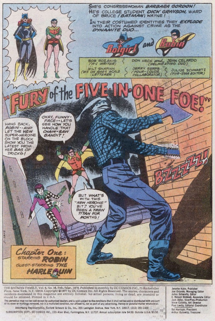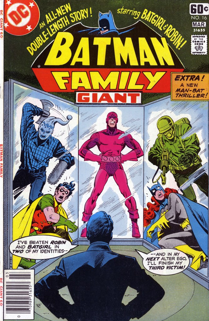 Bought this issue of BATMAN FAMILY at my regular 7-11. I was reading the title regularly, the only BATMAN book I was following so routinely, and I can’t actually tell you why. Maybe it was the format, possibly it was that I liked the Man-Bat solo stories. But I wasn’t particularly a fan of either Robin or Batgirl, nor did most of the stories in the title stick to my ribs. I suppose some of the appeal was simply things like the gimmick outlined on this cover-that the Dynamite Duo was going to be facing a villain who had three separate identities.