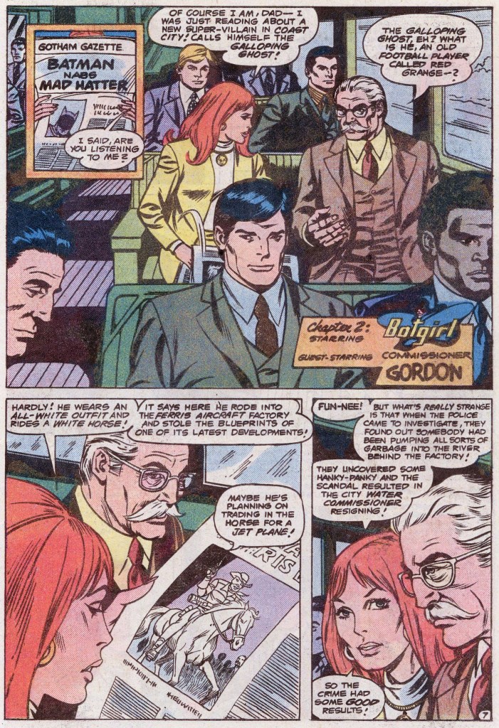 Believe it or not, the Lumberhack manages to outwit and outfight Robin and the Harlequin and make his escape–the next morning, Dick Grayson reads all about it in the local paper. And that’s our segue to Barbara Gordon, who is also reading a news story, this one about a different villain, the Galloping Ghost, who heisted plans from Ferris Aircraft, Barbara and her father Commissioner Gordon are taking the train from Gotham to Washington DC, but Gordon and his men are secretly escorting a htiman who is turning State’s Evidence to his Grand Jury appearance. But their train is attacked by yet another super-villain.