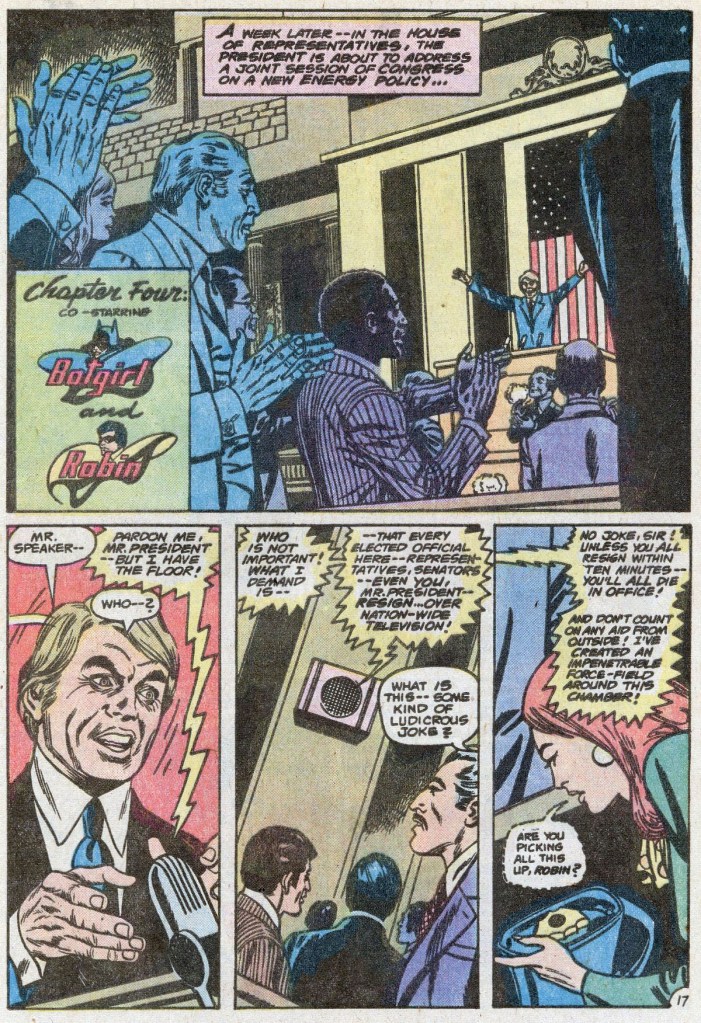 What’s more, Barbara has figured out the villain’s pattern and where he’s likely to strike next. And so, a week later, as President Jimmy Carter addresses Congress, Barbara and Robin are in position when a mysterious voice cuts off the chamber in a force-field and threatens to kill everyone inside it unless the President and all of the members of Congress publicly resign. Robin is in the control room, and when Barbara stands up to comment on the situation, her hair is strangely green. The technicians, thinking that something is wrong with the picture, move to adjust it–all except one, who is color blind. He’s the man Robin is looking for. Batgirl and Robin are able to follow him and then defeat him, and the crisis is over. (He was using his multiple identities to obscure his own guilt, passing himself off as multiple criminals while he gathered the tools he’d need for each successive impersonation.)