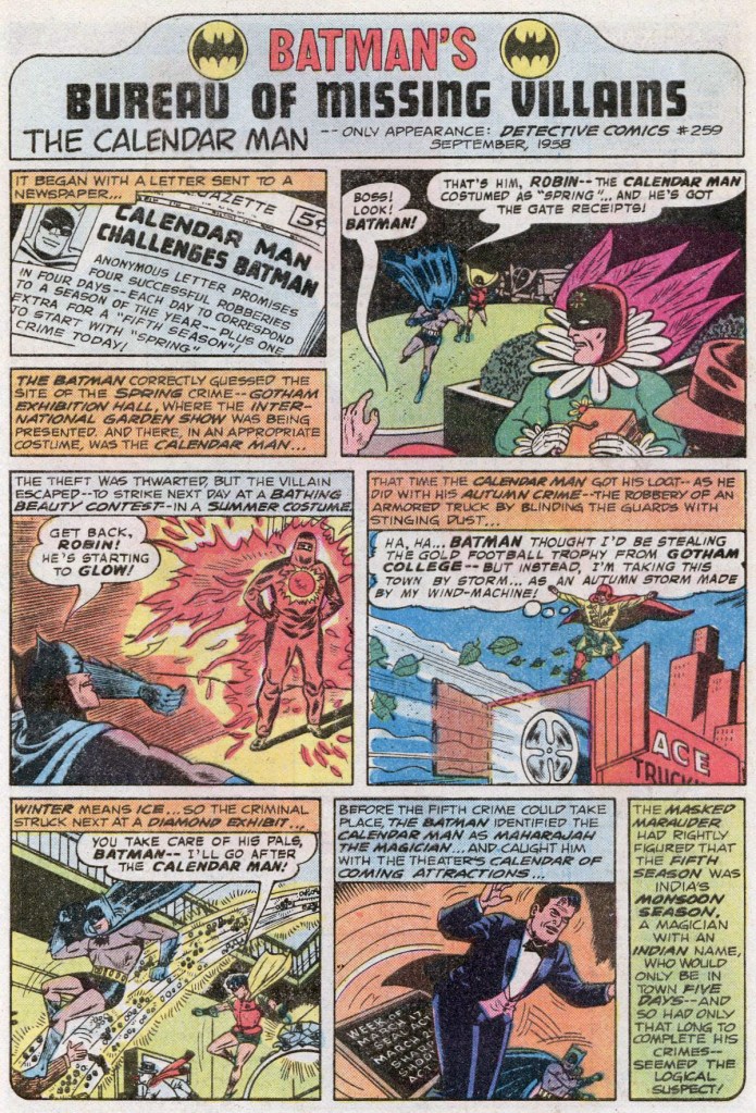And the issue wraps up with another feature on an obscure foe of Batman’s. This time, the malefactor is the Calendar Man, who hadn’t been seen in close to twenty years at this point. He’s a pretty ridiculous villain, but that didn’t stop him from going on to greater notoriety years later as the central figure in Jeph Loeb and Tim Sale’s epic BATMAN: THE LONG HALLOWEEN