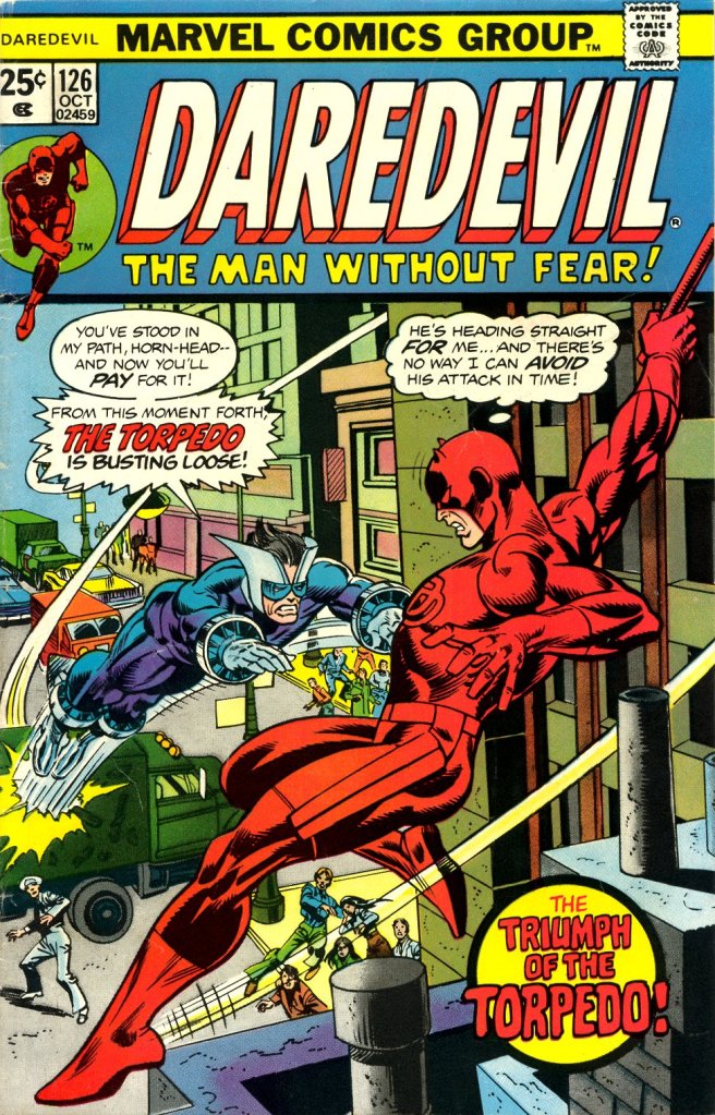 As I’ve mentioned previously, all throughout this period I would semi-regularly check back in at the Big Bin of Slightly-Older Comics that my local drugstore chain kept, pretty much any time my family went there. The way this would typically work is that I’d have developed an interest in a particular title, and so I’d go to the bin and pull up whatever issues of that book they happened to have. This was the case with this issue of DAREDEVIL, which was one of two that I bought that day. The other was #134, which also featured the Torpedo–this gave me the erroneous impression that he was an important character in the series.