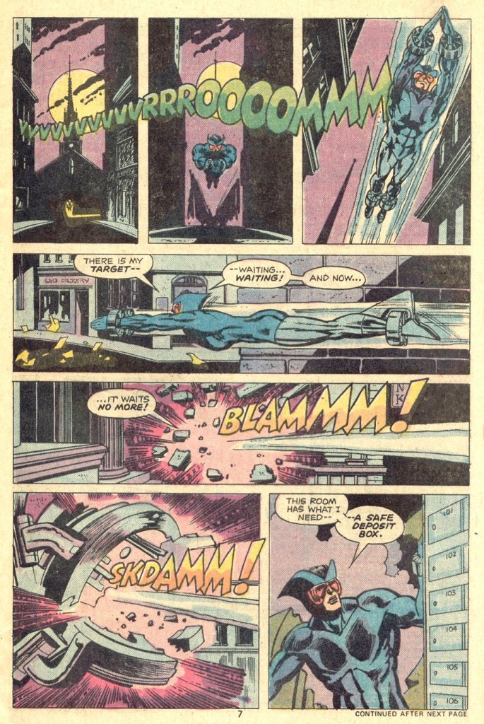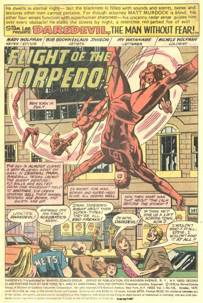 What follows is a big old multi-page Marvel battle between the Man Without Fear and his fast-flying quarry. The Torpedo identifies himself and tries to get Daredevil to back off, but to no avail. And as Daredevil and the Torpedo go at it, a few stories up, Brock Jones is working late and hears the ruckus outside (the second time in this story tat somebody got involved because the Torpedo just happened to be outside their window. Hey, Marv was a young writer at this point.) He heads for the elevator to check out whatever’s going on downstairs.