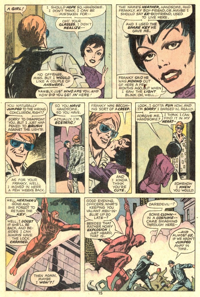 This turns out to be the introduction of Heather Glenn, who would go on to become Matt Murdock’s girlfriend and who would eventually commit suicide many years later. Here, she’s a flighty Mary Jane Watson type whose previous boyfriend gave her a key to Matt’s new apartment when he used to live there. Matt and Heather have a quick exchange that’s clearly a set-up to her coming back into the series again later, and then, seconds later, Daredevil is out the window and in pursuit of the Torpedo.