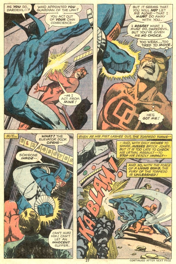 As fate would have it, by this point the more powerful Torpedo has Daredevil on the ropes, his back pressed up against the elevator doors. The Torpedo trows what is meant to be a death-blow at DD just as those doors open–and as Daredevil dodges the attack, it’s Brock Jones who is in the firing line! At the last instant, not wanting to harm an innocent person, the Torpedo twists away, sending his rocket punch into the side of the building itself, causing an explosion and a cave-in.