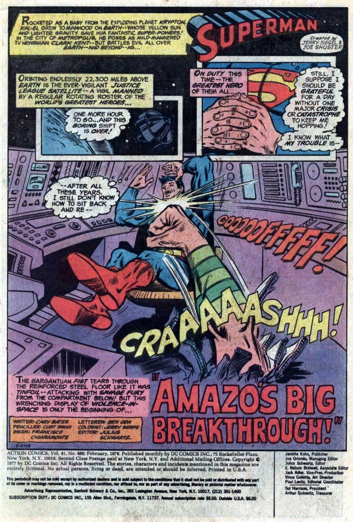 I bought this issue of ACTION COMICS on one of my weekly runs to the 7-11. This would have been right after the second INCREDIBLE HULK television movie aired for the first time. That production led to a regular weekly program for the green goliath and turned my brother into a short-term Hulk booster. But this post is about ACTION COMICS, right? Here, somebody didn’t consider the copy-safe area on this cover well enough, and so much of the copy in that lower right corner gets trimmed off. That’s not a problem with the trim on this copy, it’s a mistake on the production end.