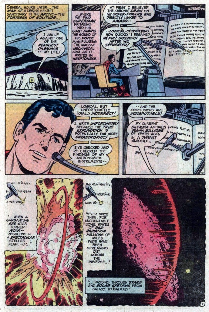 Amazo is incredibly overpowered, and Superman is feeling sluggish–he assumes this is due to Amazo tapping into his own powers. Either way, Superman is send crashing to Earth behind a runaway meteorite, smashing into the ocean. He’s ultimately unharmed by this, but Amazo has gotten away. A worried Justice League prepares to attempt to track him down. Meanwhile, though, in his Fortress of Solitude, Superman has diagnosed what the problem with his powers is. A billion years ago, a huge red star went super-nova, sending out an enormous wave of red sun radiation. That radiation is now passing through Earth’s solar system–it’s what caused Amazo to reactivate. But it’s having a detrimental effect on Superman himself, steadily reducing his powers. He estimates that he’s currently at no more than half-strength, and getting progressively weaker.