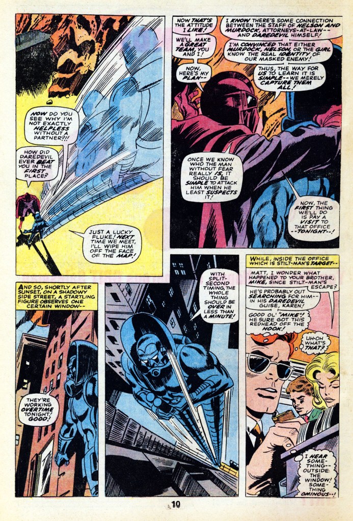 Elsewhere, in hiding, the Masked Marauder shows off his helicopter’s new disintegrating force-field to his new ally, and the Stilt-Man responds by demonstrating his own prowess. As hard as it may be to accept today, it’s honestly true tat this guy was a regular and recurring villain in the Marvel Universe for decades–despite the fact that his main ability is to elongate his legs into stilts several stories tall. But later on in this issue, we’d get to see what the Stilt-Man could really do. For now, the Masked Marauder has determined, based on his prior confrontations with Daredevil, that DD must really be somebody who works at Nelson & Murdock’s law office–and so he proposes that they abduct the three-person staff (Matt, Foggy and Karen Page) so that they can determine which one is really Daredevil and finish them off.