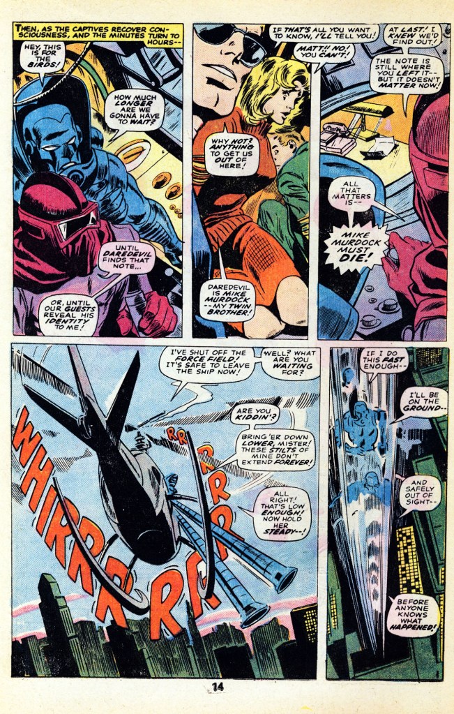 It’s worth mentioning at this point that this story was published during the period when, in order to safeguard his true identity with Foggy and Karen, Matt had made up the story that he had a twin brother, Mike Murdock–and that it was Mike who was really Daredevil. This is important here (and not just because of the title of the story) because once Matt, Karen and Foggy are captured by the two villains, Matt immediately gives up “Mike’s” true identity to them in a gambit to gain an advantage over his foes. And he does–armed with this knowledge, the Stilt-Man heads out to try to hunt down Mike Murdock, leaving Matt with only one enemy to contend with.