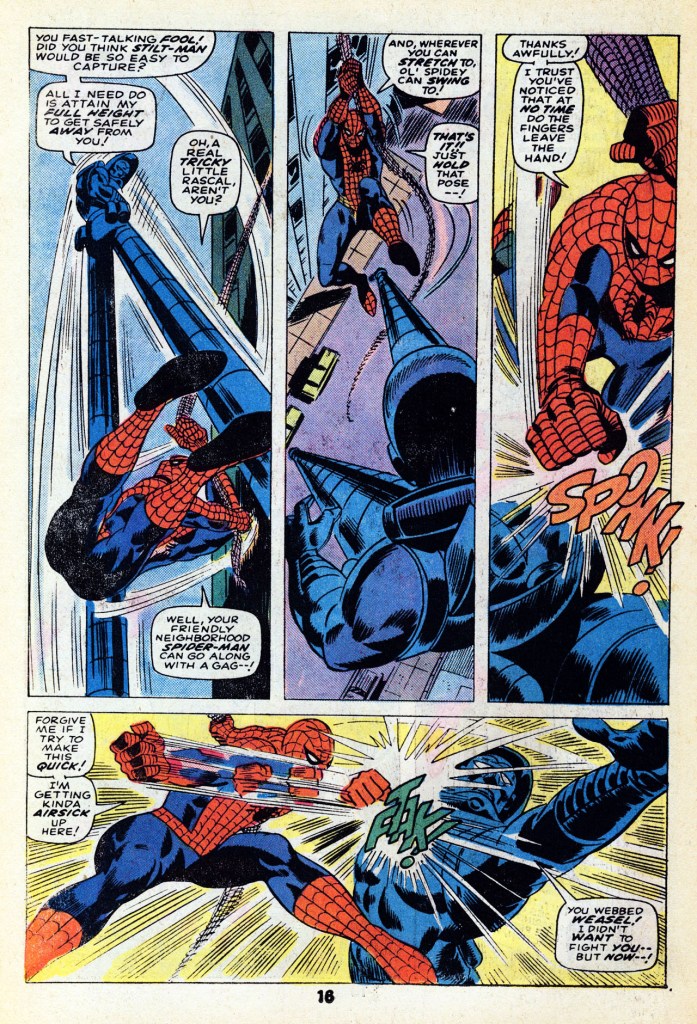 Even knowing that Daredevil is Mike Murdock, the Stilt-man doesn’t have clue one as to how to locate him–so he decides to burglarize a jewelry store in the hopes of luring Daredevil to him. A rocket scientist this guy was not. And who should show up in response to the alarms than out guest-star Spider-Man? Spidey and the Stilt-Man engage in a multi-page fight, and it’s to Spidey’s everlasting shame that not only does he not clobber the Stilt-man in about two seconds (maybe try pushing him over, Spidey!) but in fact, the Stilt-Man is able to catch the wall-crawler off-guard with a faceful of gas, incapacitating Spider-Man while the Stilt-man makes his getaway. Truly, this was the Stilt-Man’s finest hour.