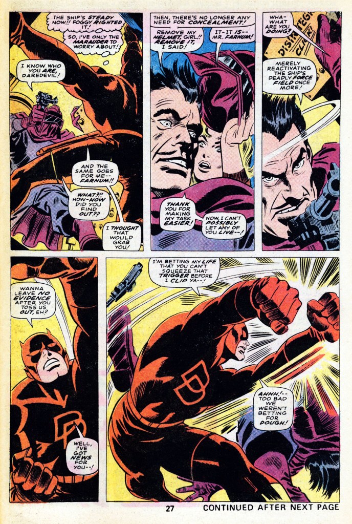 Back at the helicopter, the Masked Marauder has decided that he doesn’t really need his three hostages after all, and moves to start dumping them out the door and into the disintegrating force-field that surrounds his craft. This is the opportunity that Matt has been waiting for–he goads the Marauder into tossing him out first, after knocking him into the force-field controls and deactivating them, then grabs onto the landing gear, shedding his outer clothes to return moments later as Daredevil to take the fight to the Marauder.
