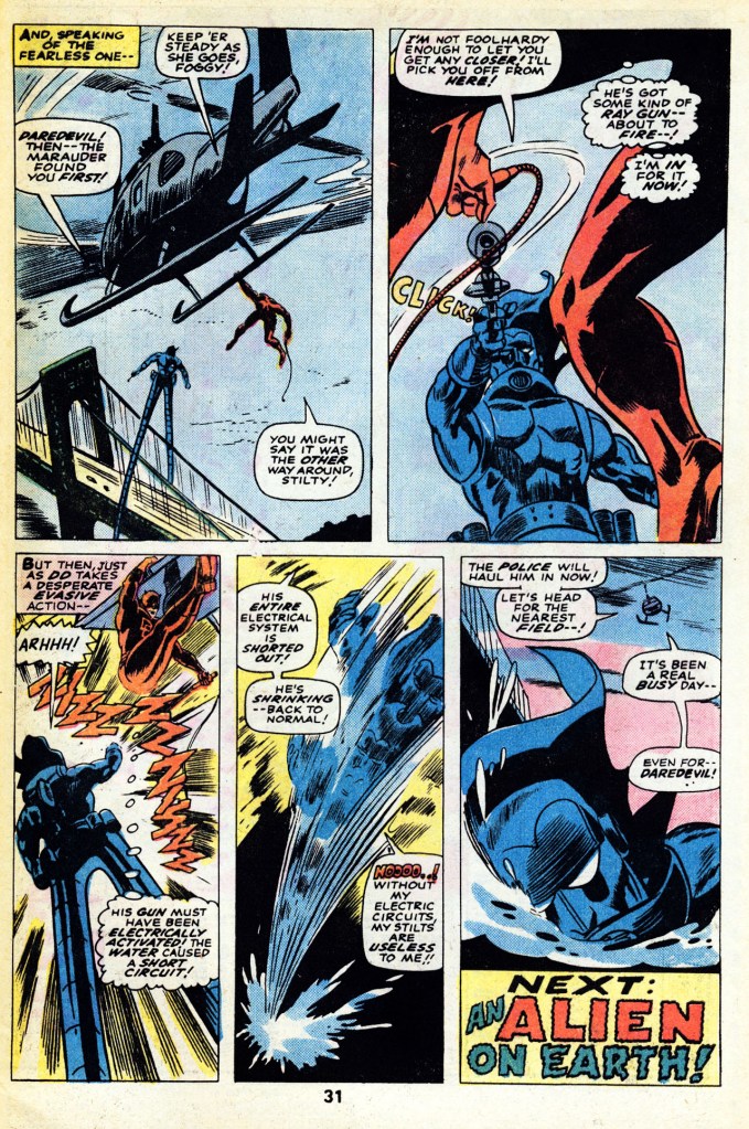 But there’s still the Stilt-Man to deal with, right? And that guy just beat Spider-Man, so he must be riding high. And this is where Colan’s odd pacing rears its head in this issue. Having used up so much space already on the prior Spidey-Stilty and DD/Marauder fights, Colan is out of pages–and so when Daredevil and the helicopter come upon the Stilt-Man, he’s making his way across the river–and the water completely short-circuits his armored rig as soon as he tries to fire off one of is weapons. It’s an ignominious defeat for the once-glorious Towering Titan (and it looks to me as though Colan intended for DD to have diverted Stilt-Man’s ray gun with his Billy Club cable, causing him to blast himself–but Stan chose to script this moment differently.) And that’s where the issue wraps up. The whole thing is completely bonkers, but in an extremely fun and engaging manner, and I completely enjoyed it.