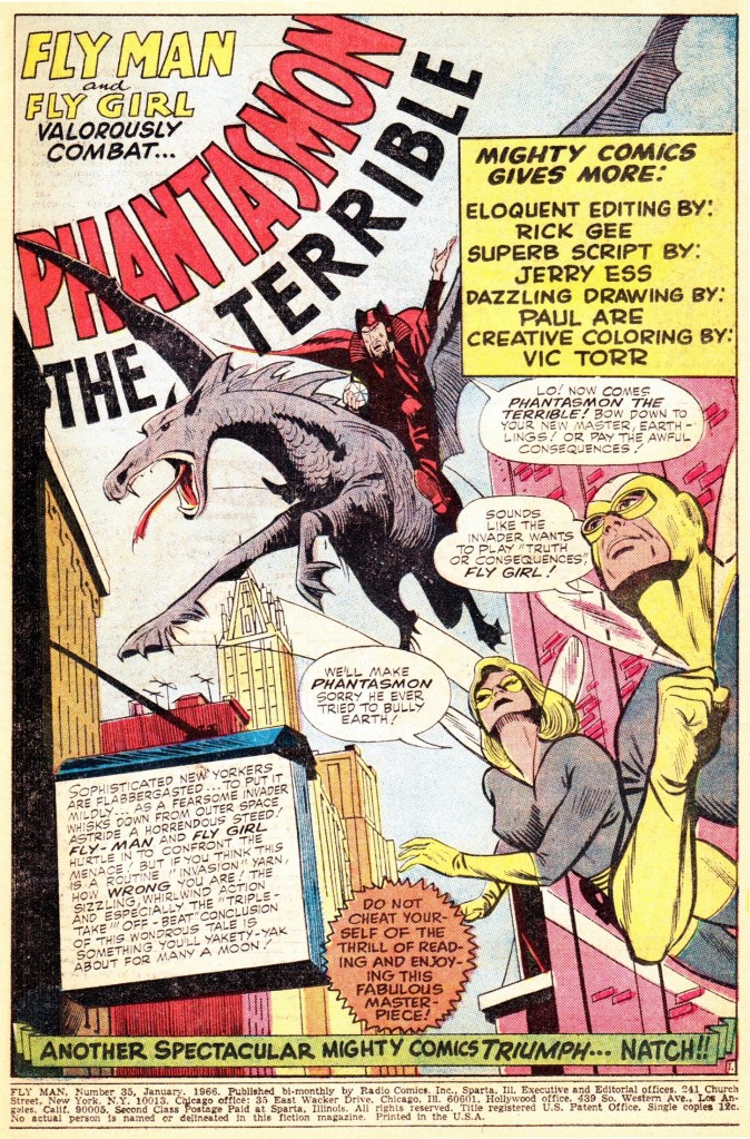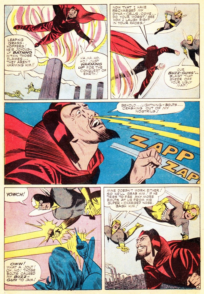 A few months earlier, having become aware of the growing popularity of Spider-Man, Mighty Comics had retooled it’s long-running series THE FLY (originated by Joe Simon and Jack Kirby) into the Marvel knock-off FLY MAN. They expanded on the Fly’s powers as well, giving him the ability to shrink and grow that Giant-Man possessed and overtly moving to mimic the sensibilities of the Marvel brand. Given how many years Marvel publisher Martin Goodman had rode the coattails of the fads of the day by producing scads of knock-offs, this must have been seen as poetic justice.
