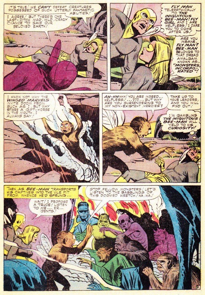 But we’er almost out of pages, so it’s time for the wrap-up. In desperation, Fly Man transmits a telepathic call to his enemy the poorly-names Iniquitous Bee Man, a card-carrying member of Monsters, Incorporated, letting Bee Man know that he and Fly Girl are helpless. And yes, Fly Man never evidenced any telepathic powers before this panel either.