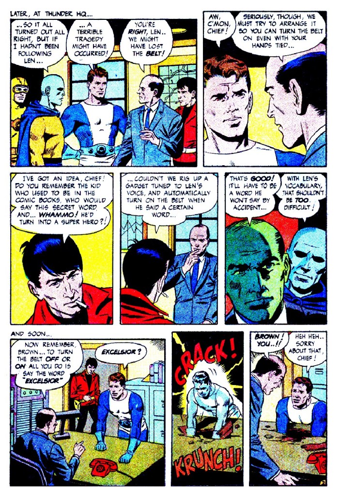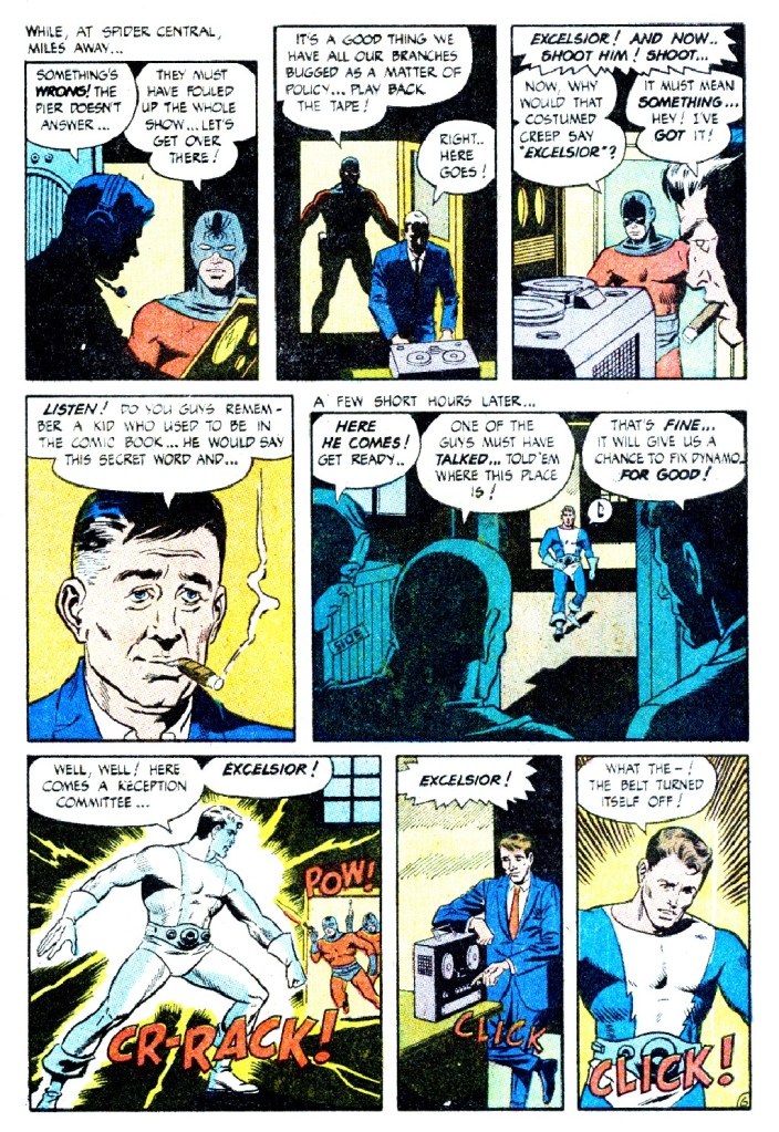 For years, I’ve always assumed that making Dynamo’s magic word in this story Excelsior was a dig at Stan Lee, but John Morrow points out that this story saw print before Stan began using it as his famous sign-off. It’s not impossible that he may have even been inspired to use it by this story, though that is unlikely.