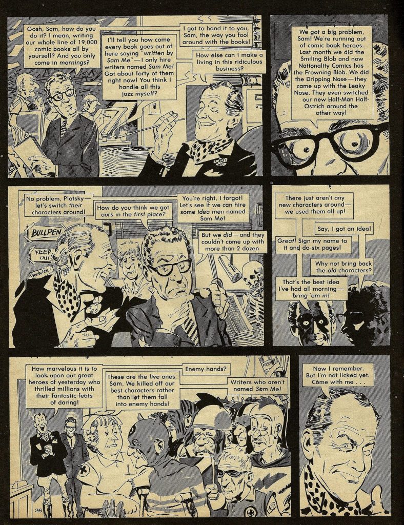 Dripko is clearly a play on Steve Ditko, and Plotsky would be Sol Brodsky, who did production work for Stan and Marvel. Also, that’s Blue Bolt, an early Joe Simon creation, on the far right in the second to last panel.