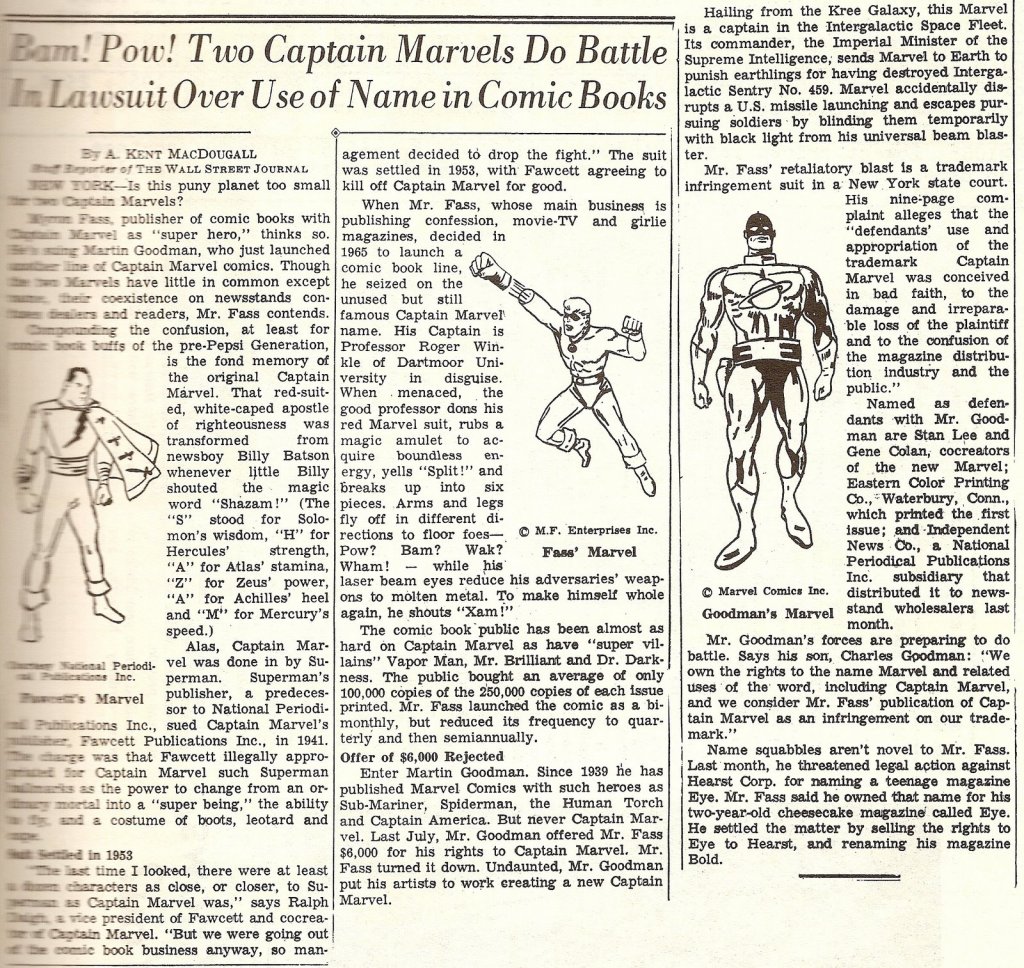 ADDITIONAL: Here’s a Wall Street Journal item from 1968 after Marvel had come out with its own Captain Marvel, causing Myron Fass to sue.