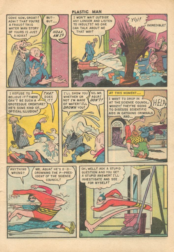 Finishing up our look at the three Plastic man stories reprinted in PLASTIC MAN #63 in 1956 after the advent of the Comics Code, and how they were edited and modified to pass muster so that they didn’t destroy the moral foundations of society’s youth the way the original printings had. Here’s the final story, which first appeared in PLASTIC MAN #25