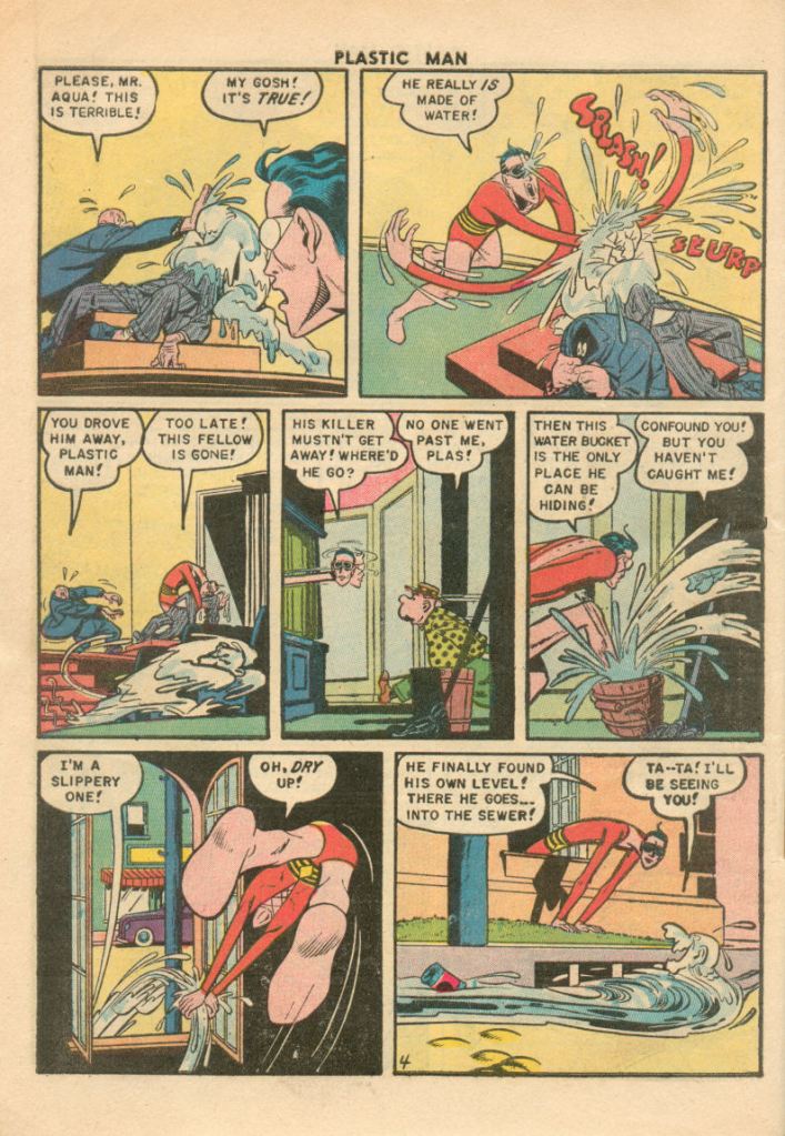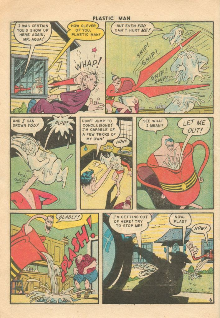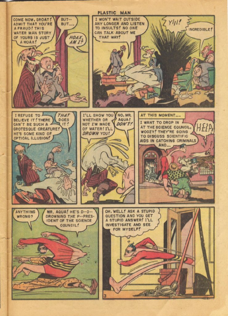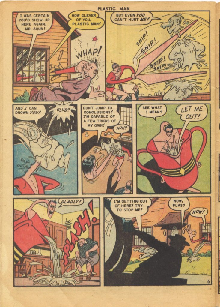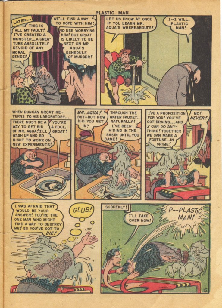 Here we get the first incredibly minor change: in panel 3, Plastic Man declares that Mr. Aqua’s victim is “gone” rather than “dead” as in the original.