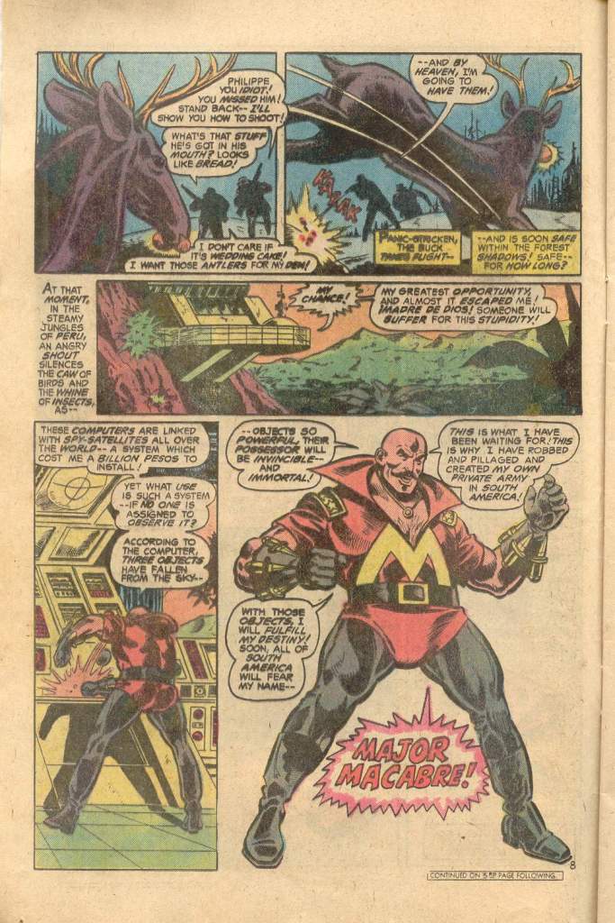 We follow the three falling satchels to where they come to rest on the ground. The first lands in a Georgia river where its contents get discharged into the polluted waters. The second arrives in the Middle East, where it’s found by a seven year old war orphan named Traya. And the third makes landfall in British Columbia, where a hungry buck consumes some of the breadlike foodstuff contained within. Meanwhile, in Peru, the thoroughly ridiculous Major Macabre has also detected the falling objects, and thinks they can bring him power, so he sets out to acquire them. And so the stage is set.
