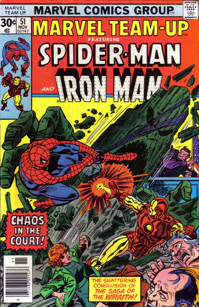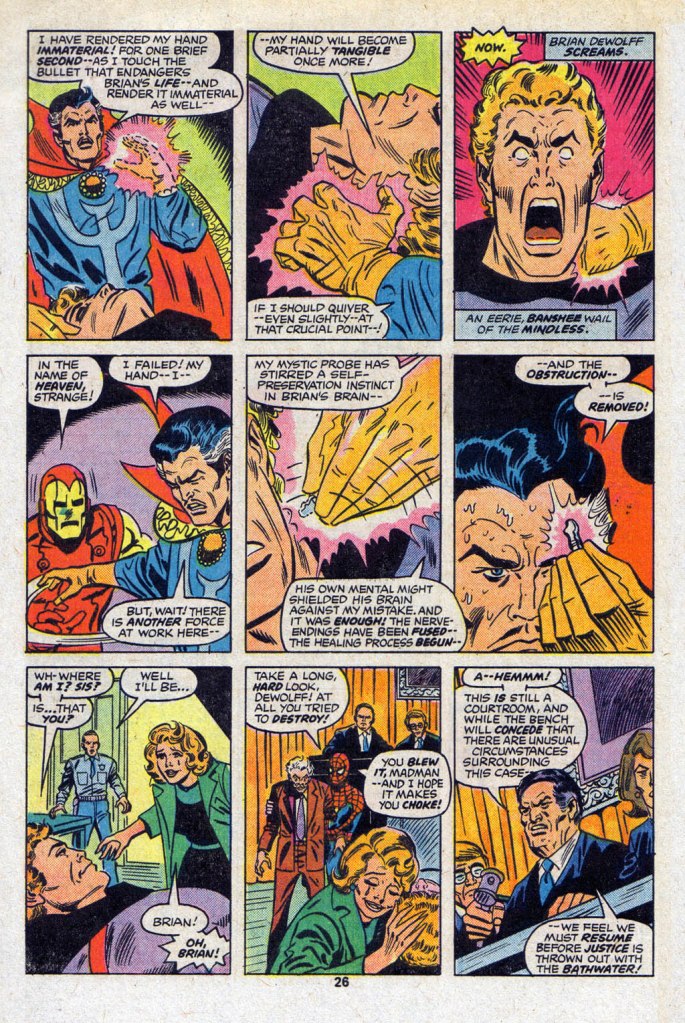 This issue was the end of a four-part storyline, an absolute epic in these days–and one which introduced the well-remembered Spider-Man supporting character Jean DeWolff (whom Peter David would years later kill off in a memorable storyline.) We open in a courtroom, where Iron Man and, surprisingly, Doctor Strange (who was the TEAM-UP guest star in the previous issue) are preparing to give testimony concerning the Wraith, the super-criminal who’d been running through this entire story. He’d been caught and unmasked as the mindless Brian DeWolff under the mental dominance of his father, Phillip DeWolff. Now, the heroes are trying to get Brian off for the crimes committed while under his father’s control.