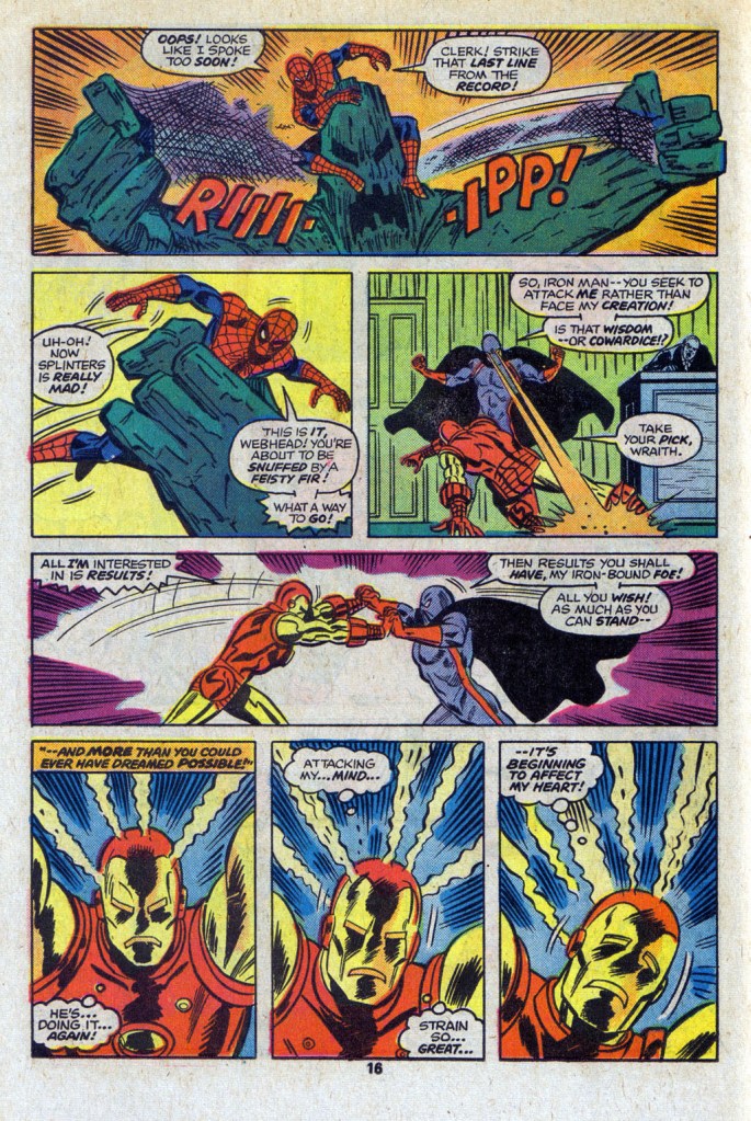 The Wraith lets out with a mindblast that flattens just about everybody in the courtroom. But then, he and his father get zapped when he comes into contact with a live electrical cable, the end result of which is that Phillip’s mind winds up inhabiting the Wraith’s body. Spidey gets involved in the fight that breaks out, but he’s not much use against the Wraith’s mind-tricks, and Dr Strange and Iron Man appear similarly stymied. It’s not a great showing from these guys especially. The Wraith is able to plant illusions in the minds of his targets, and he soon has the trio of super heroes fighting a giant stone monster that only exists in their imaginations.