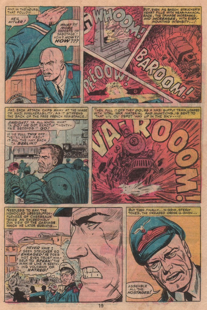 There’s a bunch of rinse-and-repeat in the story at this point, as we watch the various Howlers get into one fight after another, playing havoc with the German military in a manner that wouldn’t have been out of place on HOGAN’S HEROES. Essentially, the entire Nazi occupation force can’t lay a glove on eight Commandos, who waltz in among them and being blowing up everything in sight. And with each act of sabotage and destruction, baron Strucker grows ever more furious.