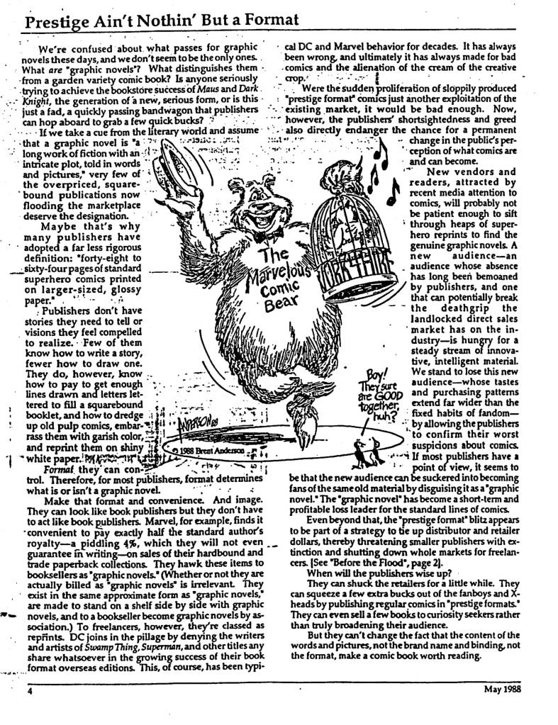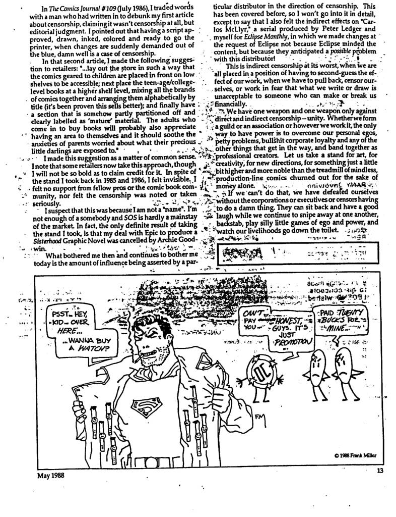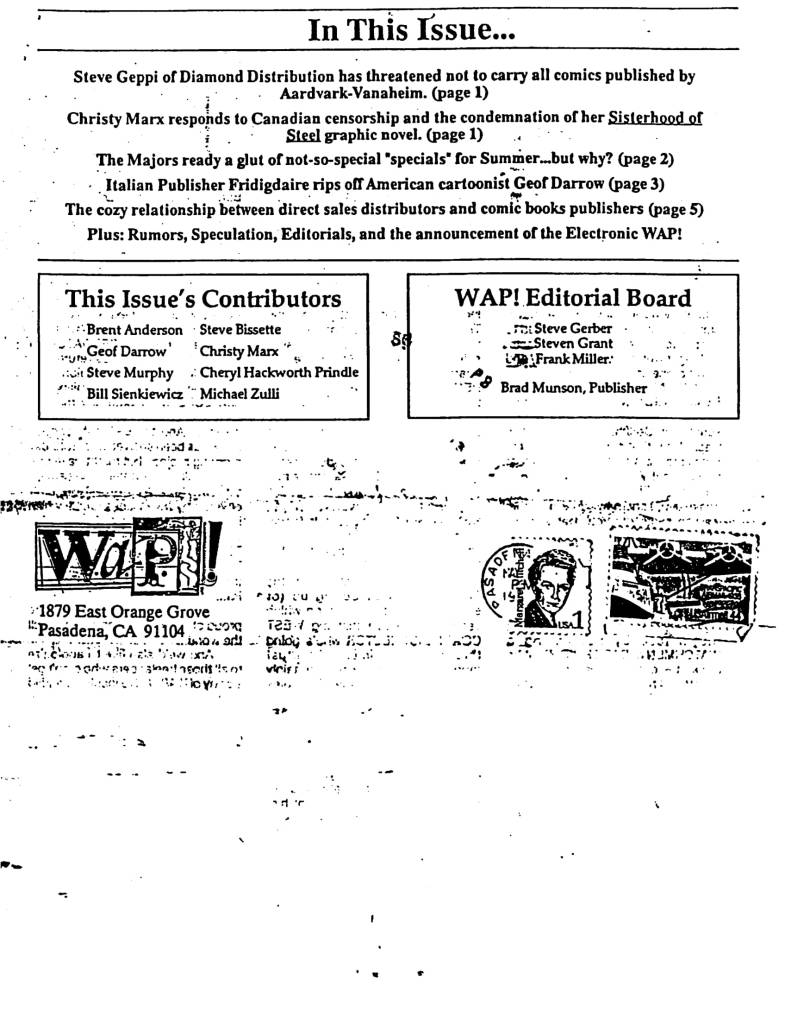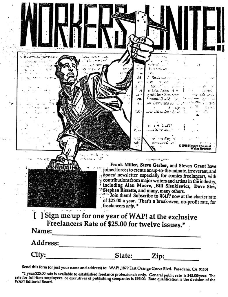 WAP – Words and Pictures #2 Tom Brevoort Classic Fanzines November 16, 2019July 3, 2021 The second issue of Steve Gerber, Steven Grant and Frank Miller’s muckraking freelancer newsletter from 1988. Share this: Click to share on X (Opens in new window) X Click to share on Facebook (Opens in new window) Facebook Click to share on Reddit (Opens in new window) Reddit Click to share on Tumblr (Opens in new window) Tumblr Click to email a link to a friend (Opens in new window) Email Like Loading... Related Published November 16, 2019July 3, 2021