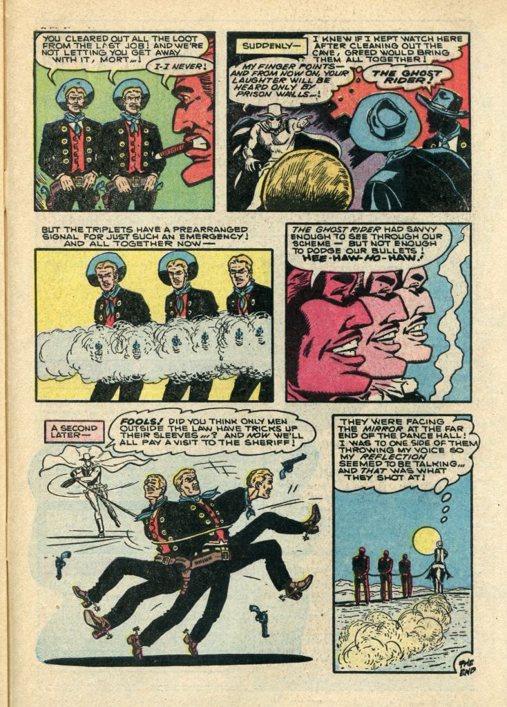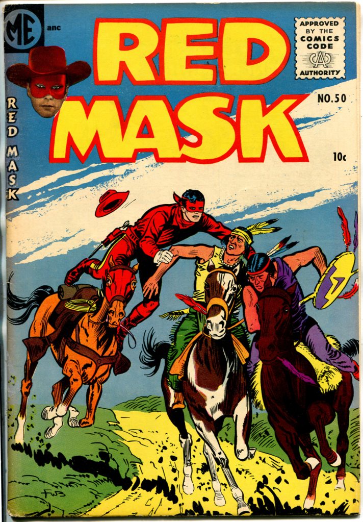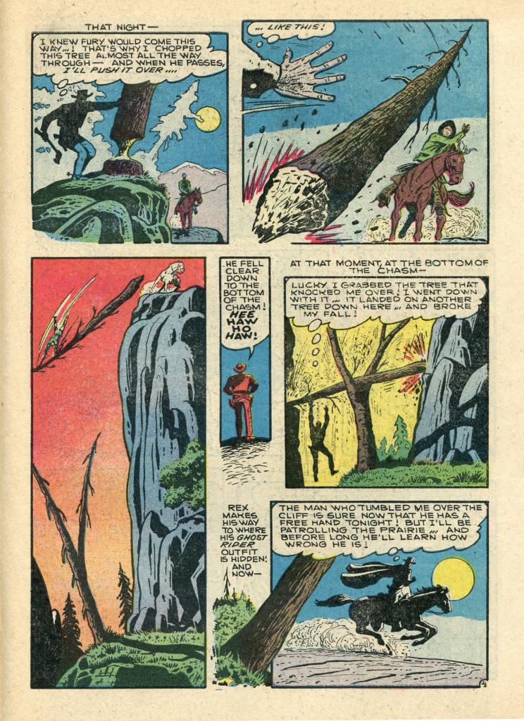 The Ghost Rider was a popular character in the later days of the Golden Age of Comics. He successfully combined several genres–super hero, western, supernatural–in a single series. It was an outgrowth of another strip entirely, the Calico Kid–at a certain point, Rex Hart (later Rex Fury) abandoned his guise as the Calico Kid in favor of the glow-in-the-dark white garb of the Ghost Rider. Ultimately, the advent of the Comics Code helped to put him out of business, where the supernatural aspect of his stories needed to be brought into line. The final Ghost Rider tale appeared in RED MASK #50 in 1955.