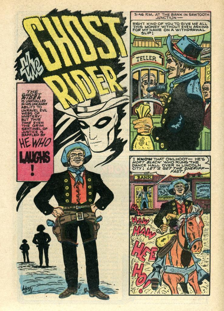 The Grand Comics Database lists Carl Memling as the writer of this story while Dick Ayers provided the art and Ernie Bache some additional inking. Apparently, the Comics Code forced the artist to add the outline of Ghost Rider’s nose and mouth to his face in order to minimize the skull-like appearance of his mask.