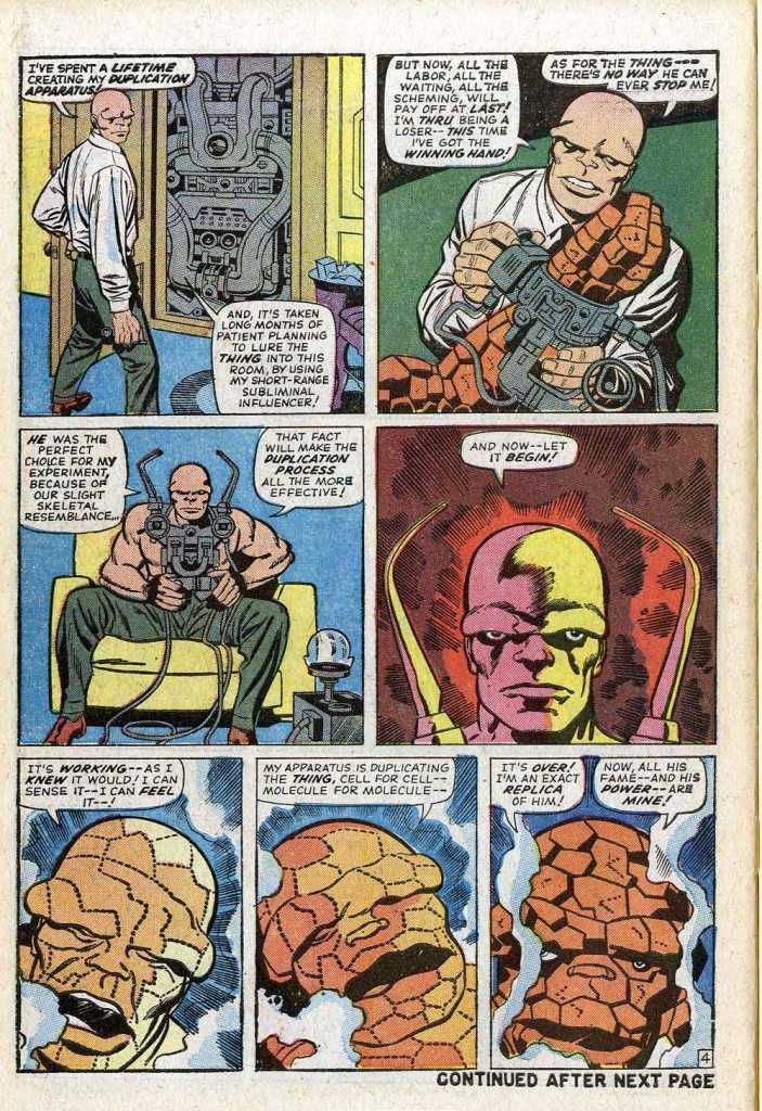 The story is pretty direct and simple. The Thing is depressed because his blind girlfriend Alicia Masters showed an interest in the alien Silver Surfer. Wandering through the rainy city, he comes across a nameless scientist (who is referred to as the Changeling in the Marvel Checklist) who gives him shelter and comfort. But he drugs Ben, and then uses a device to steal the Thing’s power and form for himself. He’s jealous of the fame and success of Mister Fantastic, and intends to use the Thing’s physique to both get into Fantastic Four headquarters and to get himself some revenge.