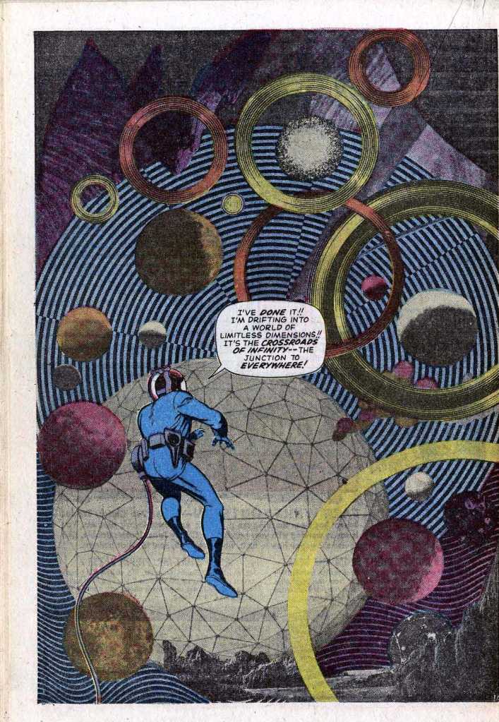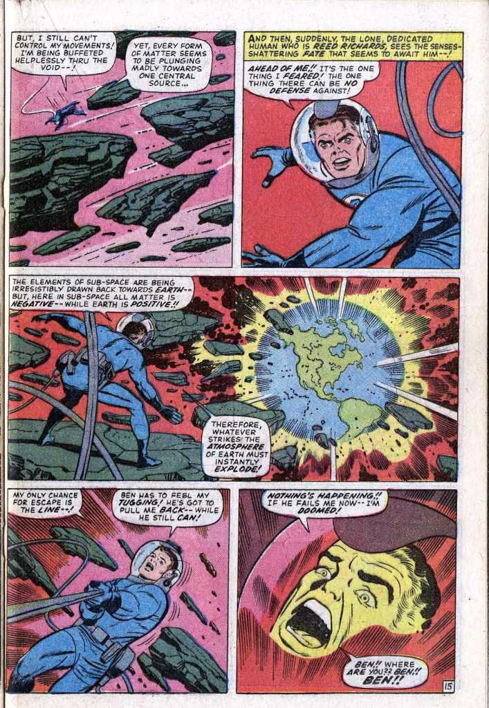 There’s also a subplot with Johnny Storm off at college that turns out to be a boondoggle that goes nowhere–in the very next issue, Johnny and his new pal Wyatt Wingfoot will be picked up by the FF for a new adventure and the Torch will never return to college. Anyway, Reed plunges into sub-space with the faux-Thing holding onto the tether which is his only lifeline back to the positive matter universe. After Kirby unleashed some mind-boggling visuals (including one of his collage pages, which in this instance didn’t reproduce too badly) , Reed discovers that all of the matter in Sub-Space is being drawn back to Earth–but since it’s all negative matter, it explodes on contact with the Earth’s atmosphere. Reed has only minutes until he’s destroyed and he signals for the Thing to pull him back. But there is no response.